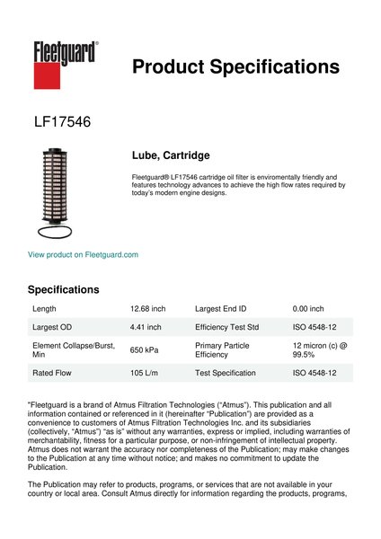 Fleetguard® LF17546 cartridge oil filter is enviromentally friendly and features technology advances to achieve the high flow rates required by today’s modern engine designs.