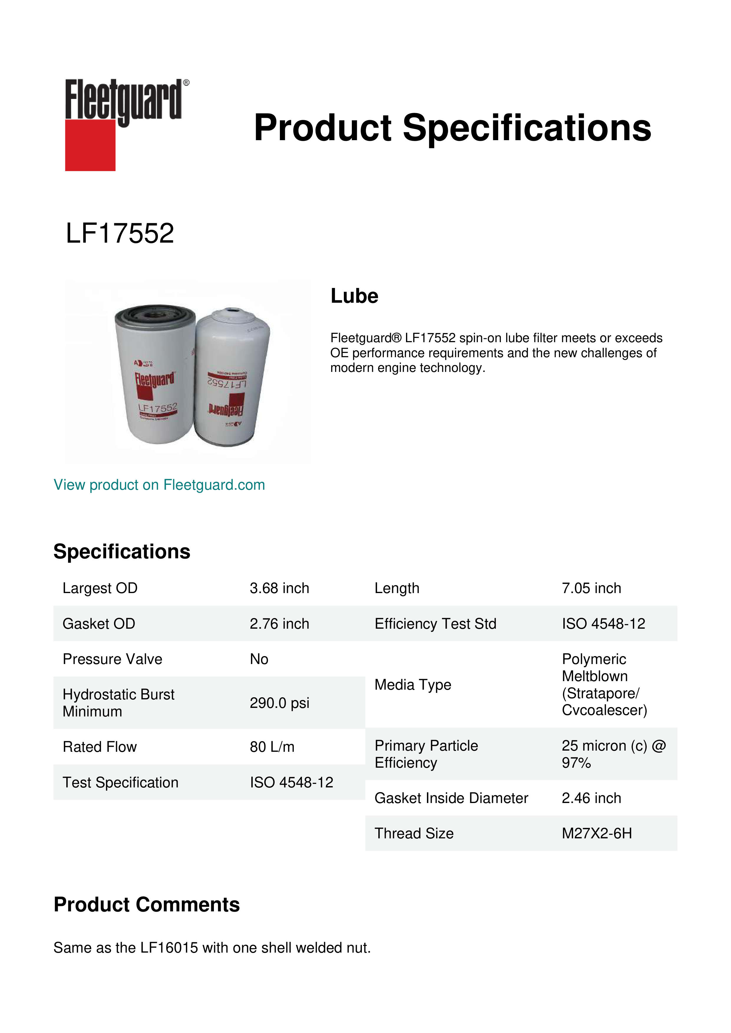 Fleetguard® LF17552 spin-on lube filter meets or exceeds OE performance requirements and the new challenges of modern engine technology.Specification