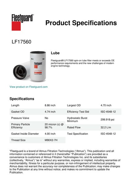 Fleetguard® LF17560 spin-on lube filter meets or exceeds OE performance requirements and the new challenges of modern engine technology.Specification