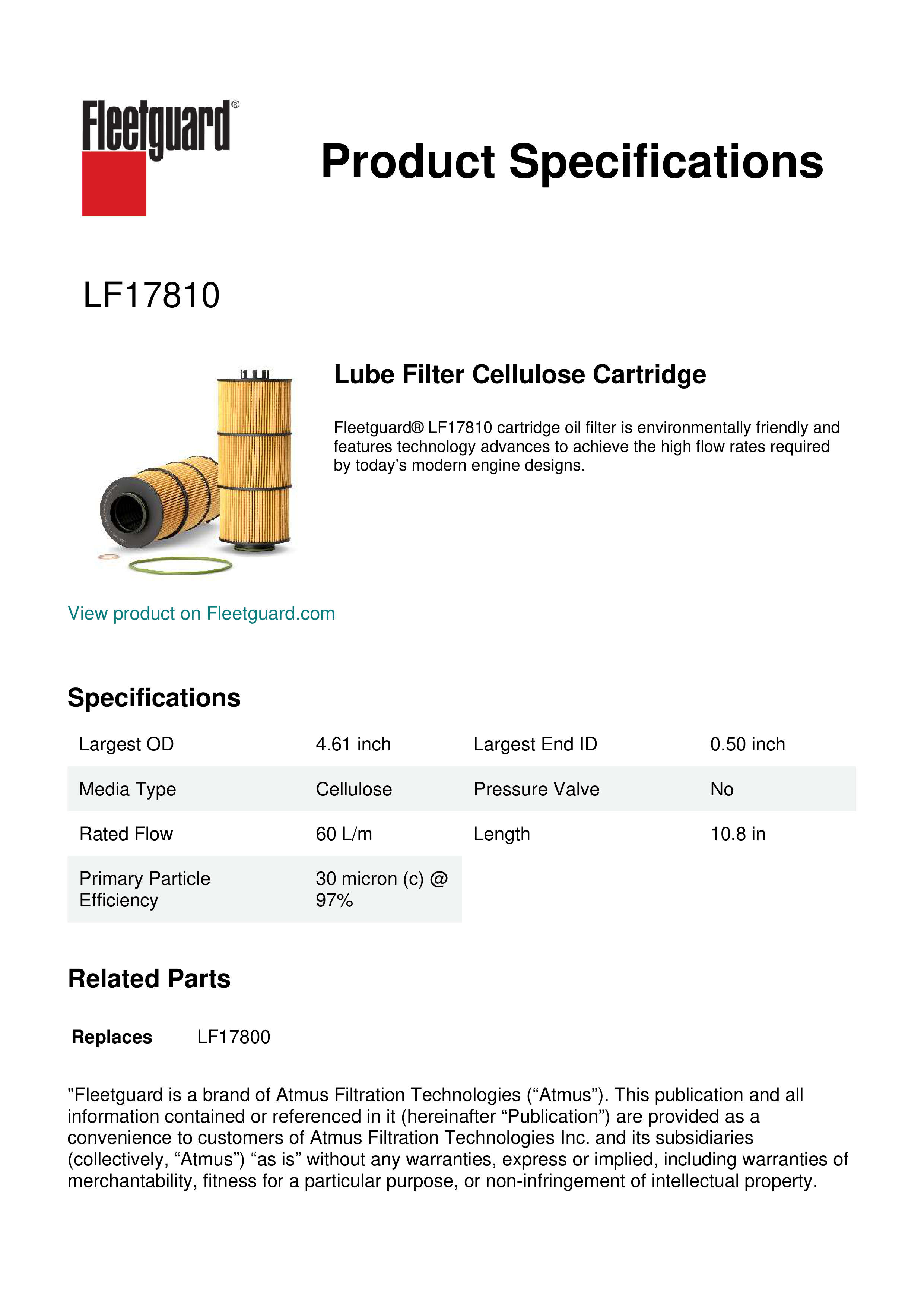 Fleetguard® LF17810 cartridge oil filter is environmentally friendly and features technology advances to achieve the high flow rates required by today’s modern engine designs.Specification