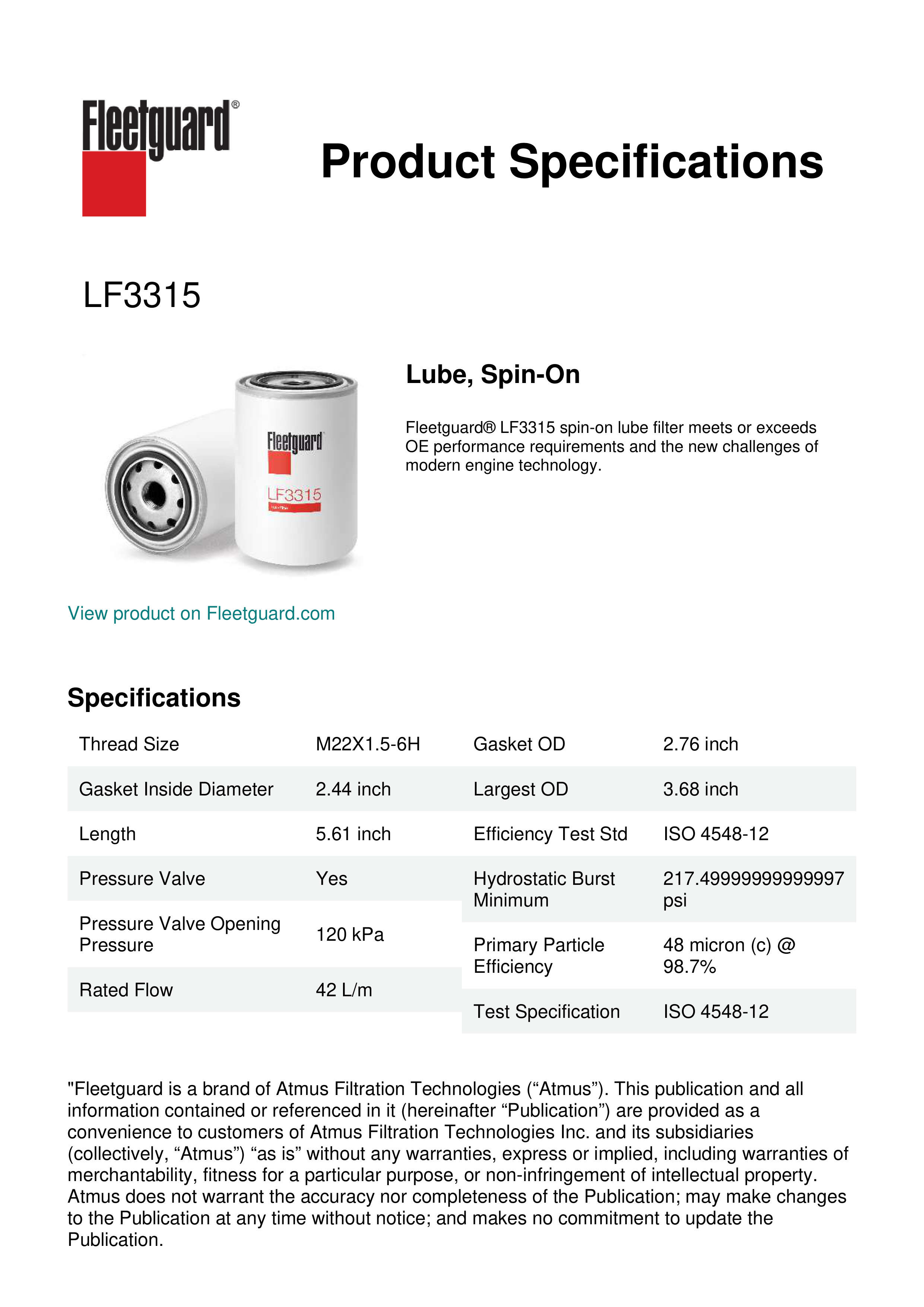 Fleetguard® LF3315 spin-on lube filter meets or exceeds OE performance requirements and the new challenges of modern engine technology.Specification