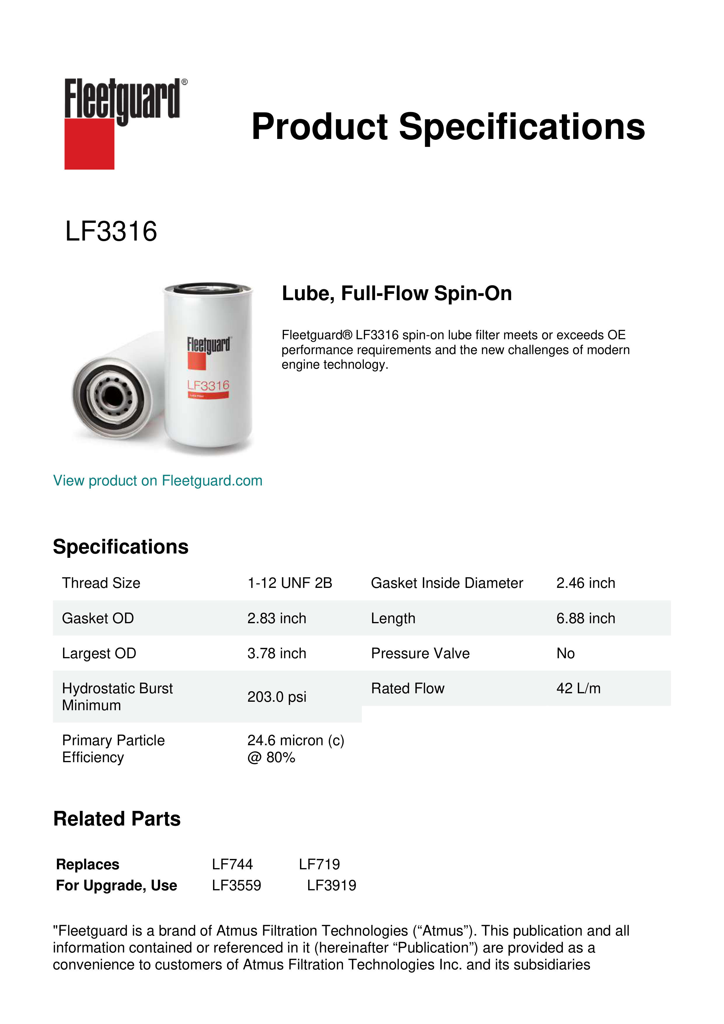 Fleetguard® LF3316 spin-on lube filter meets or exceeds OE performance requirements and the new challenges of modern engine technology.Specification