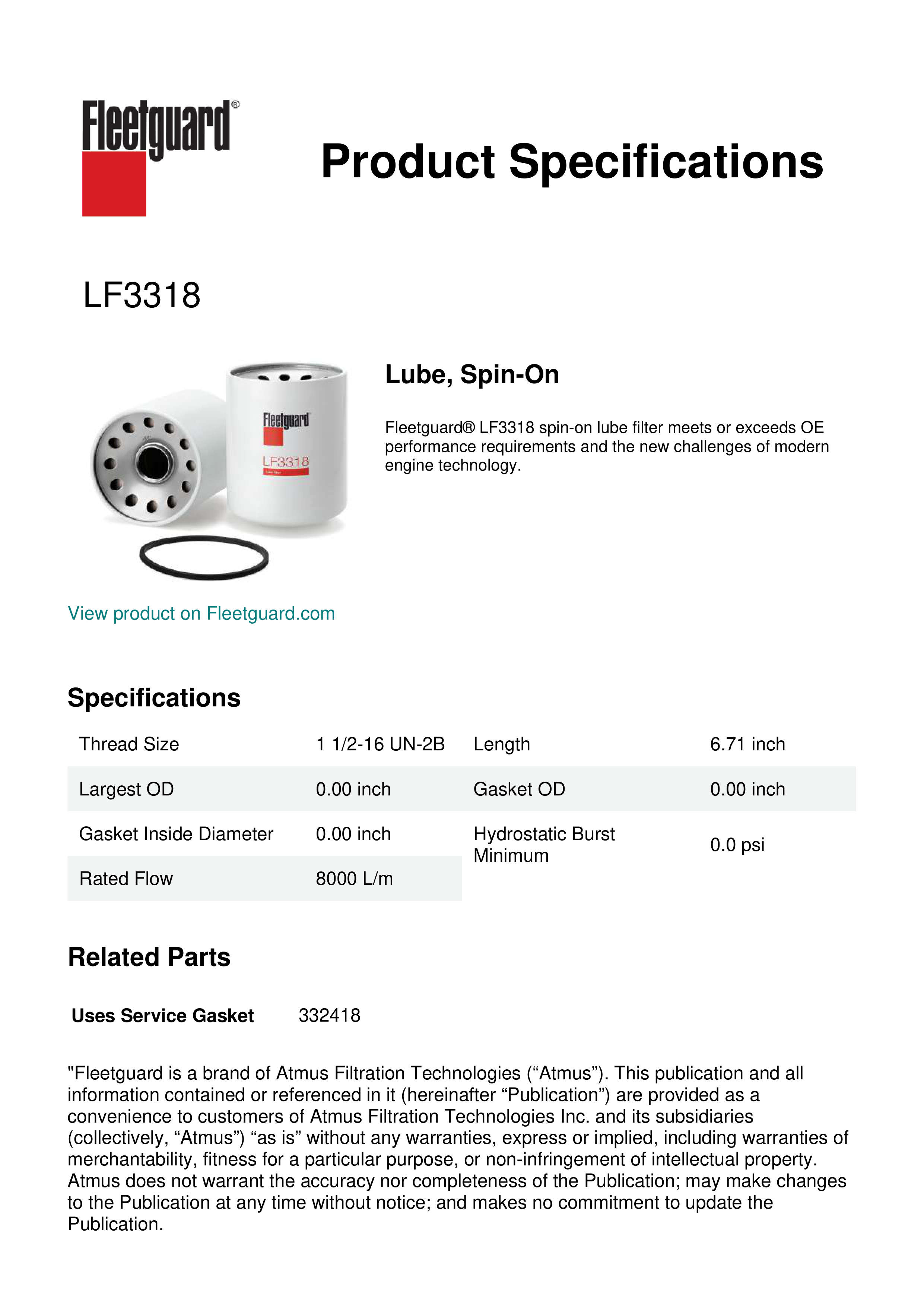 Fleetguard® LF3318 spin-on lube filter meets or exceeds OE performance requirements and the new challenges of modern engine technology.Specification
