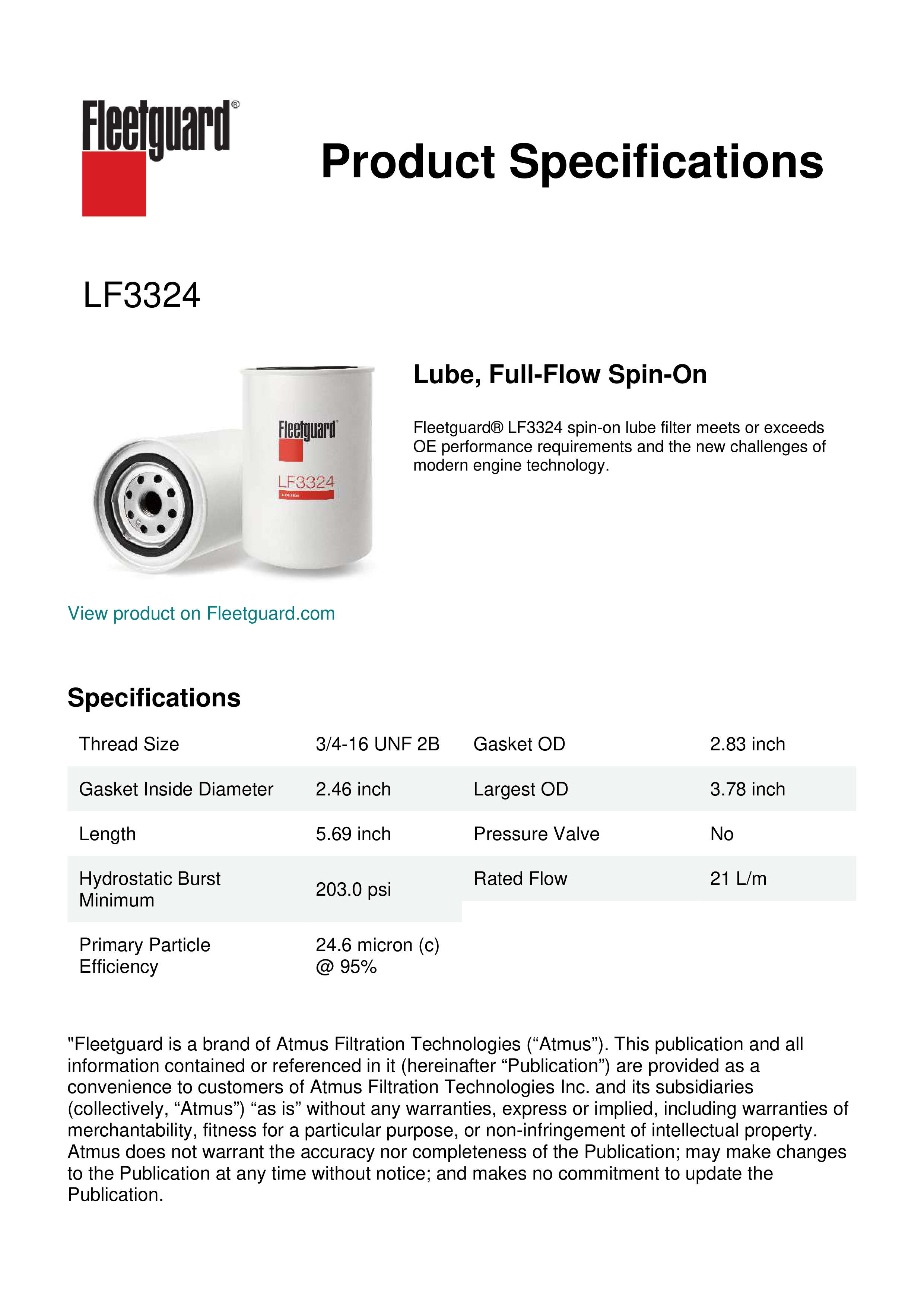 Fleetguard® LF3324 spin-on lube filter meets or exceeds OE performance requirements and the new challenges of modern engine technology.Specification