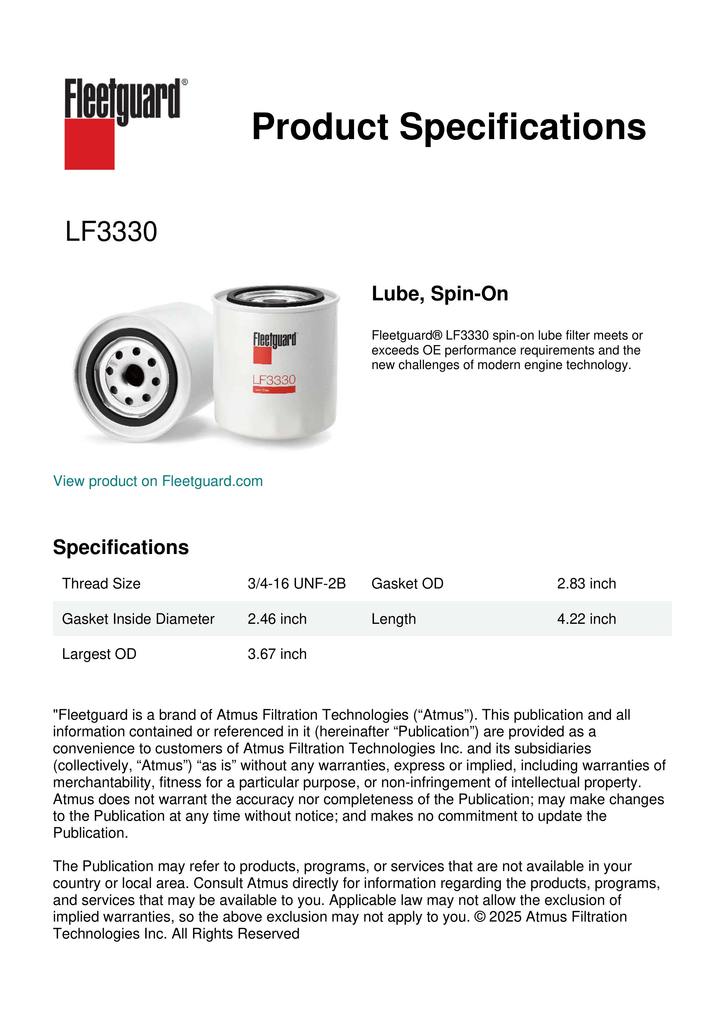 Fleetguard® LF3330 spin-on lube filter meets or exceeds OE performance requirements and the new challenges of modern engine technology.Specification