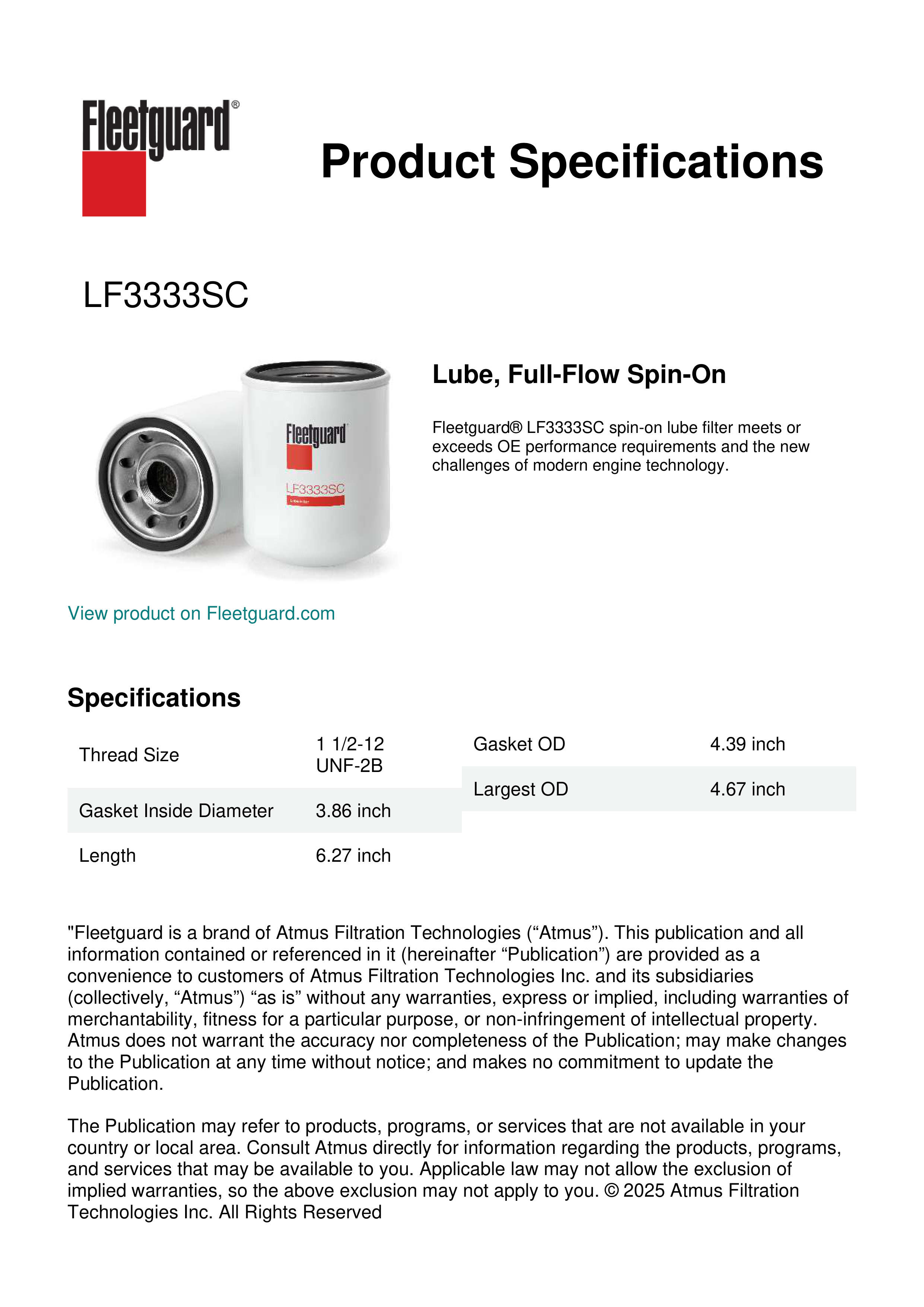 Fleetguard® LF3333SC spin-on lube filter meets or exceeds OE performance requirements and the new challenges of modern engine technology.Specification