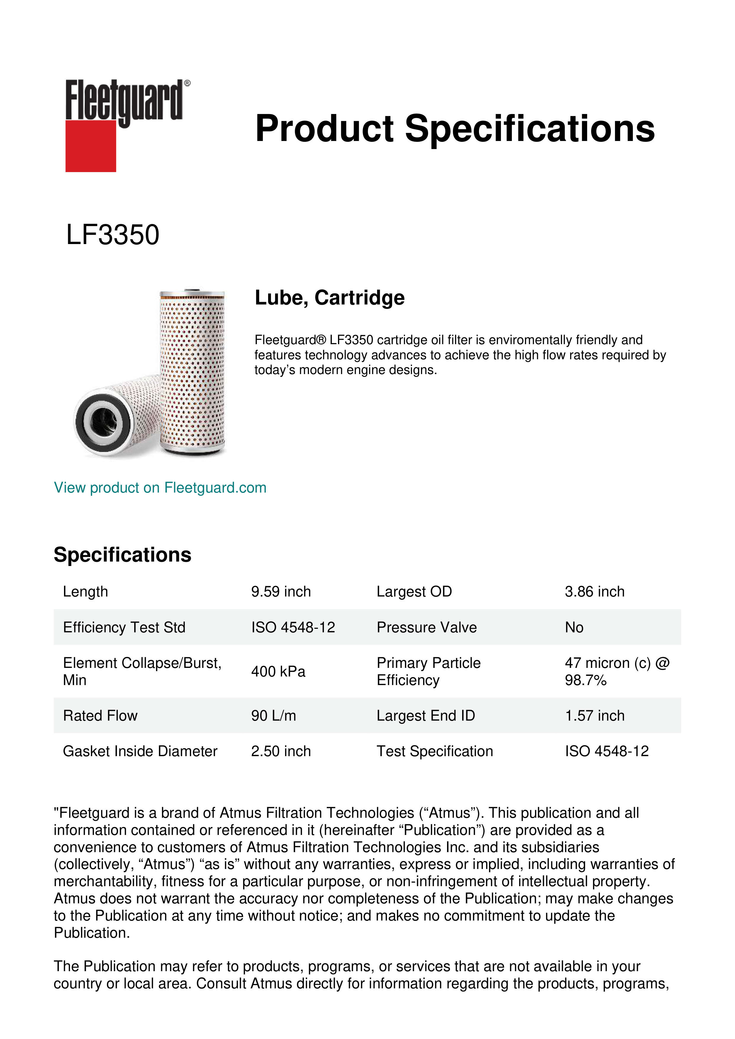 Fleetguard® LF3350 cartridge oil filter is enviromentally friendly and features technology advances to achieve the high flow rates required by today’s modern engine designs.Specification