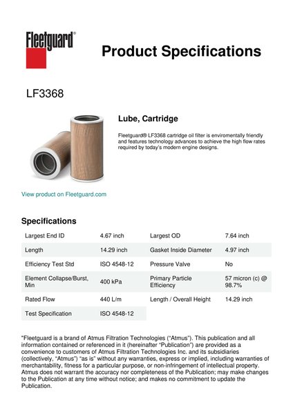 Fleetguard® LF3368 cartridge oil filter is enviromentally friendly and features technology advances to achieve the high flow rates required by today’s modern engine designs.Specification