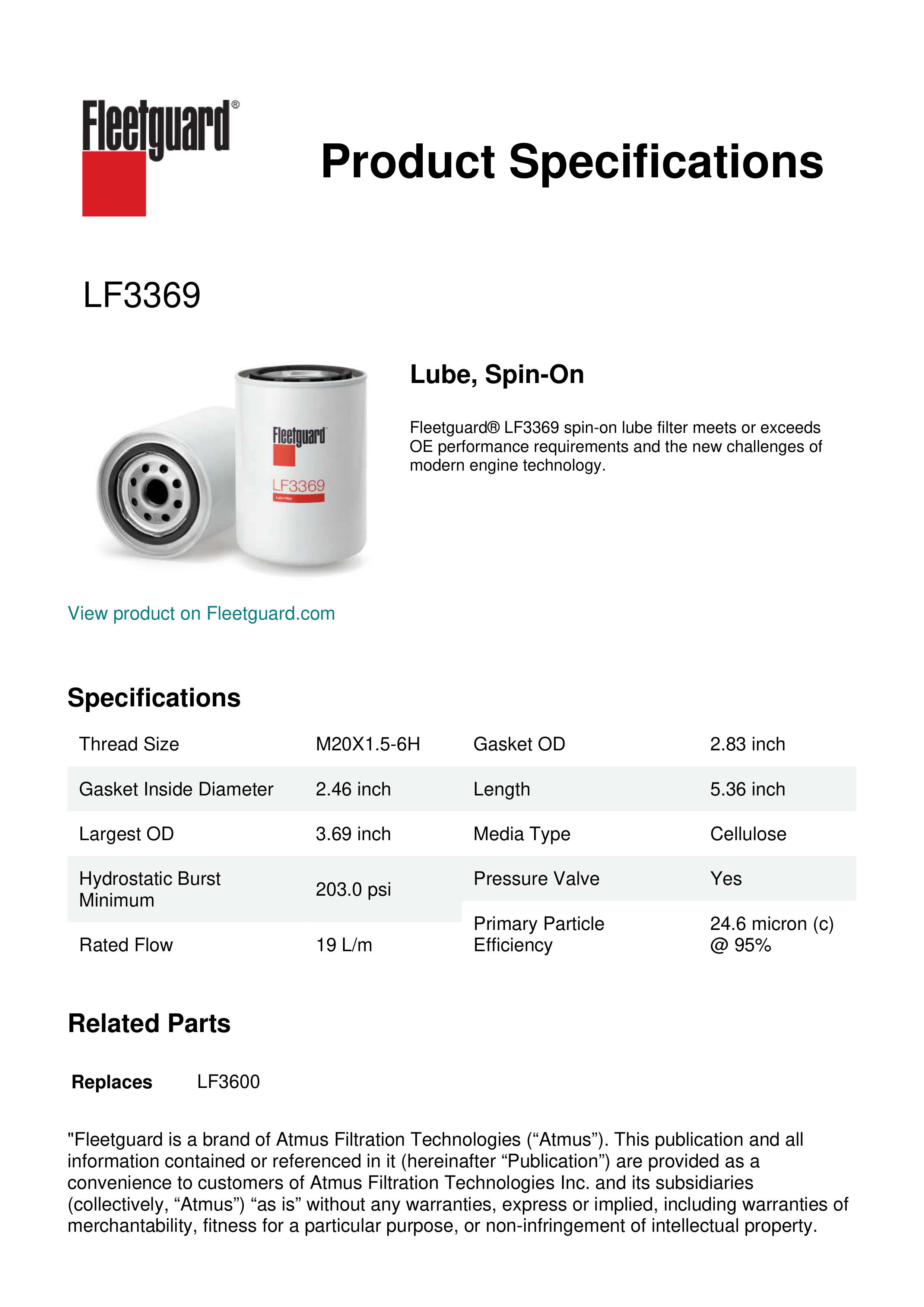 Fleetguard® LF3369 spin-on lube filter meets or exceeds OE performance requirements and the new challenges of modern engine technology.Specification