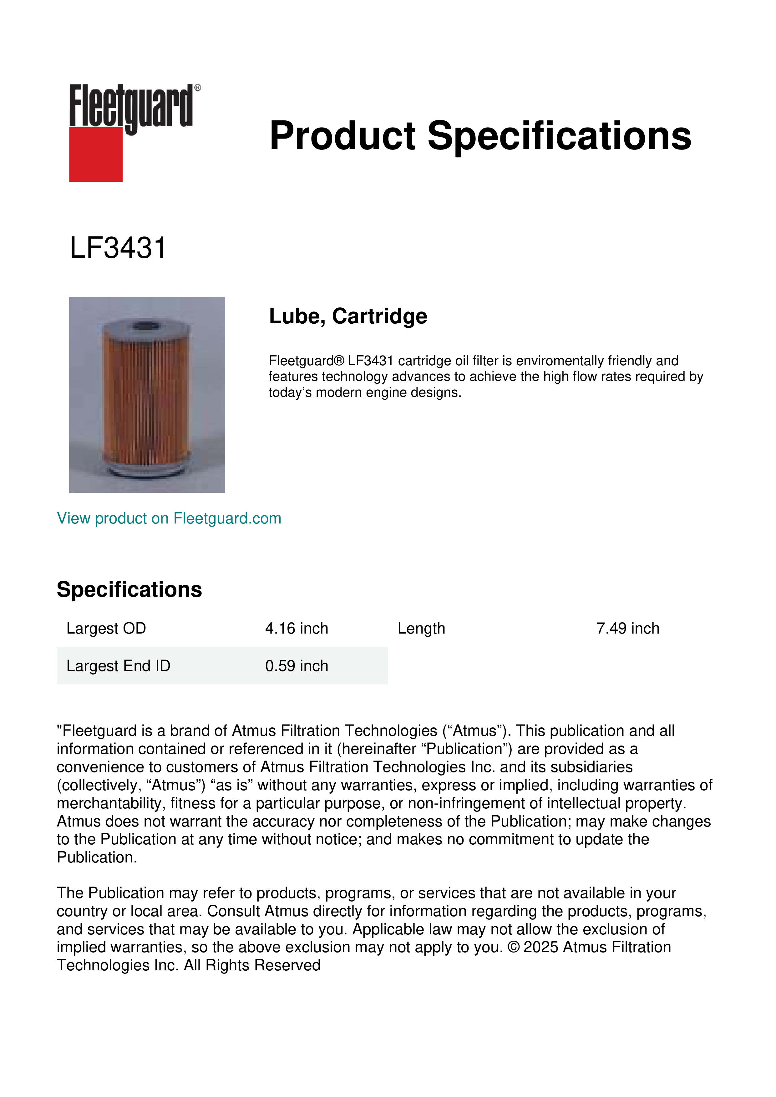 Fleetguard® LF3431 cartridge oil filter is enviromentally friendly and features technology advances to achieve the high flow rates required by today’s modern engine designs.Specification