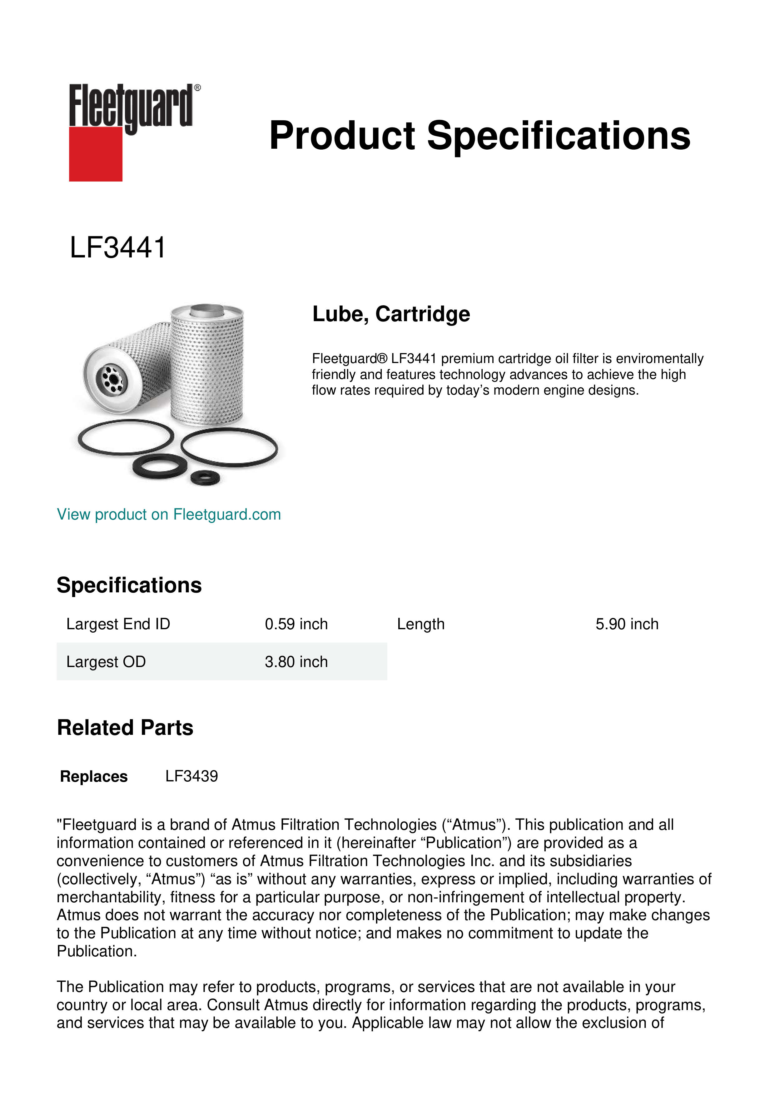 Fleetguard® LF3441 premium cartridge oil filter is enviromentally friendly and features technology advances to achieve the high flow rates required by today’s modern engine designs.Specification