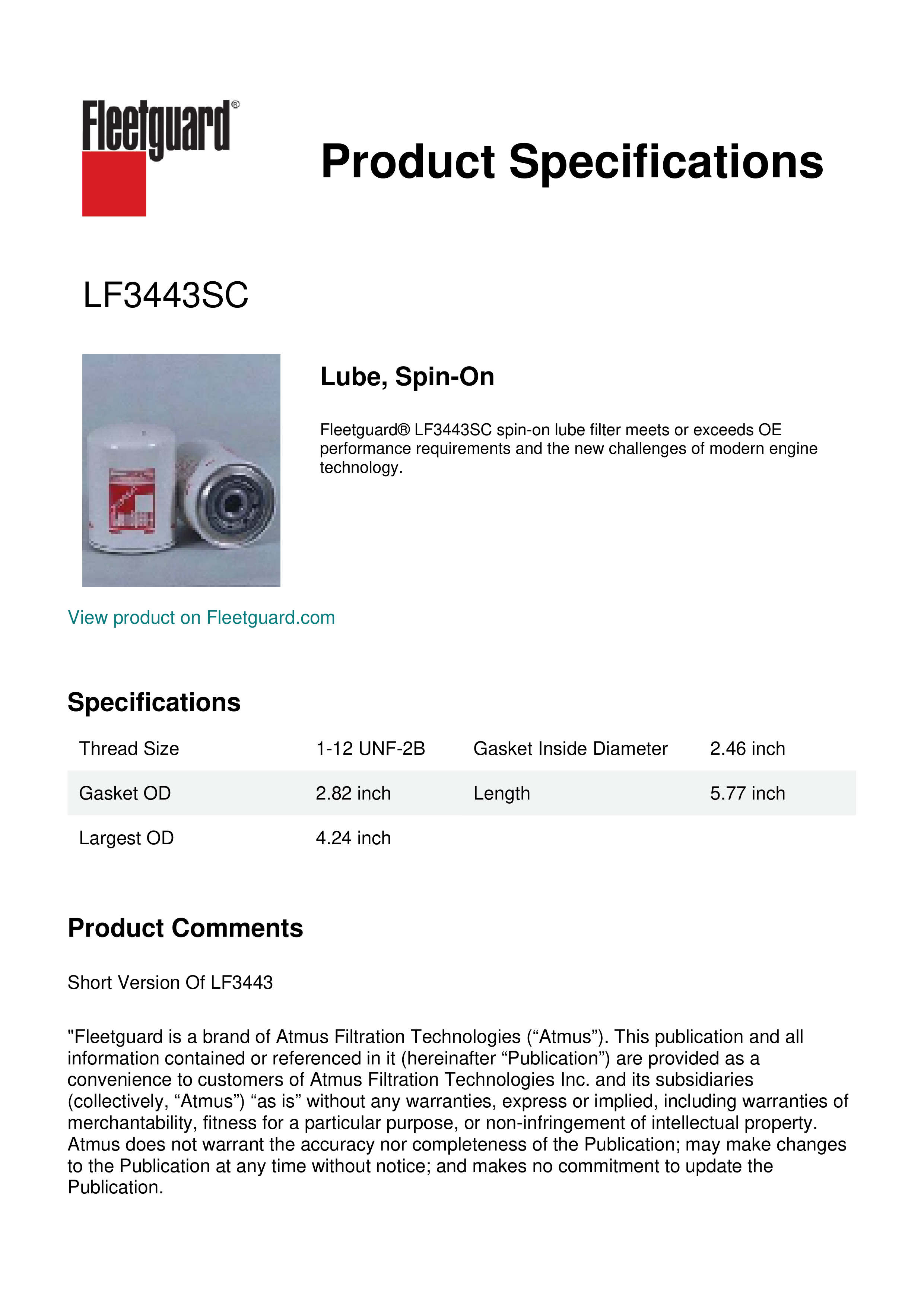 Fleetguard® LF3443SC spin-on lube filter meets or exceeds OE performance requirements and the new challenges of modern engine technology.Specification