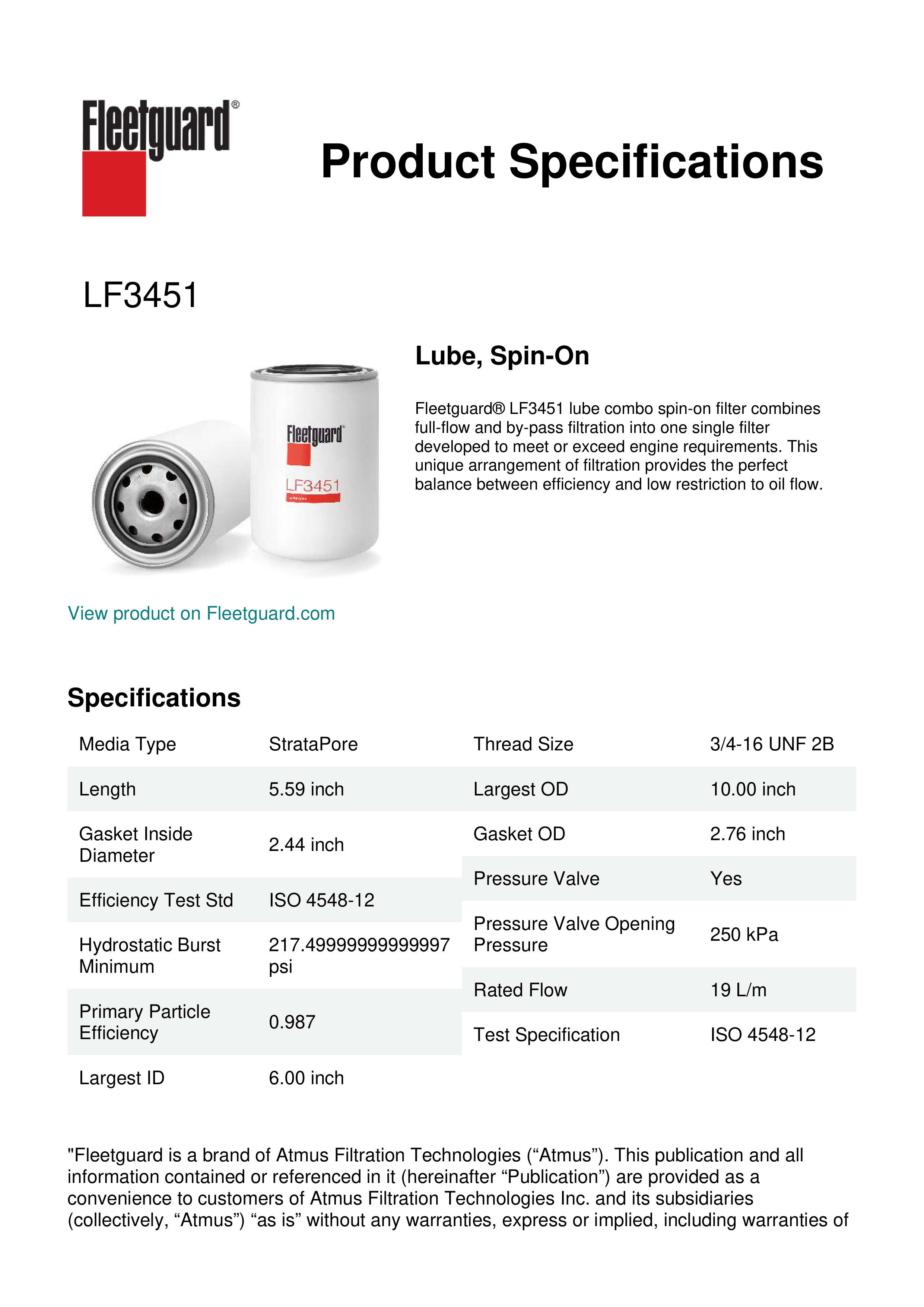 Fleetguard® LF3451 lube combo spin-on filter combines full-flow and by-pass filtration into one single filter developed to meet or exceed engine requirements. This unique arrangement of filtration provides the perfect balance between efficiency and low restriction to oil flow.Specification