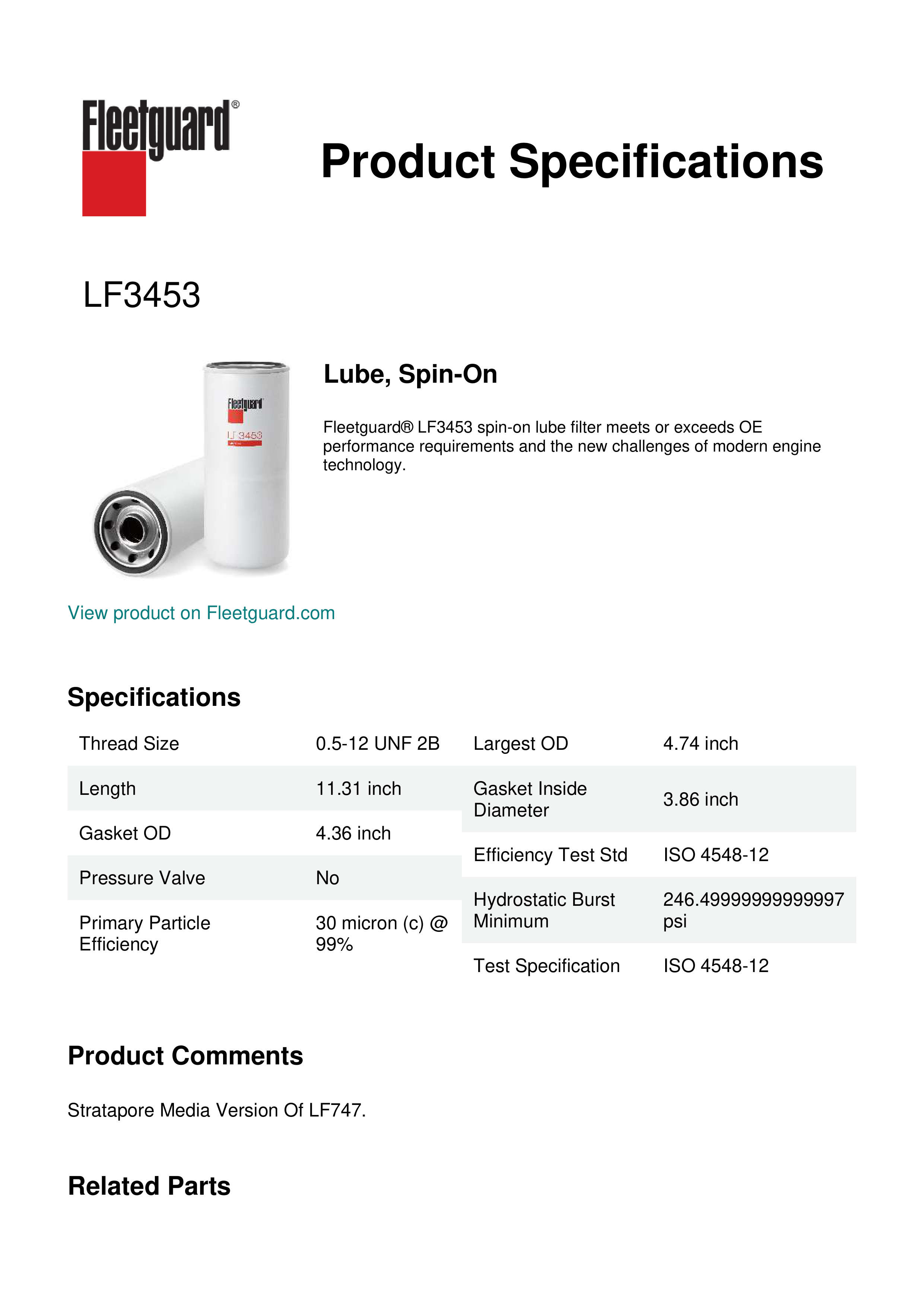 Fleetguard® LF3453 spin-on lube filter meets or exceeds OE performance requirements and the new challenges of modern engine technology.Specification
