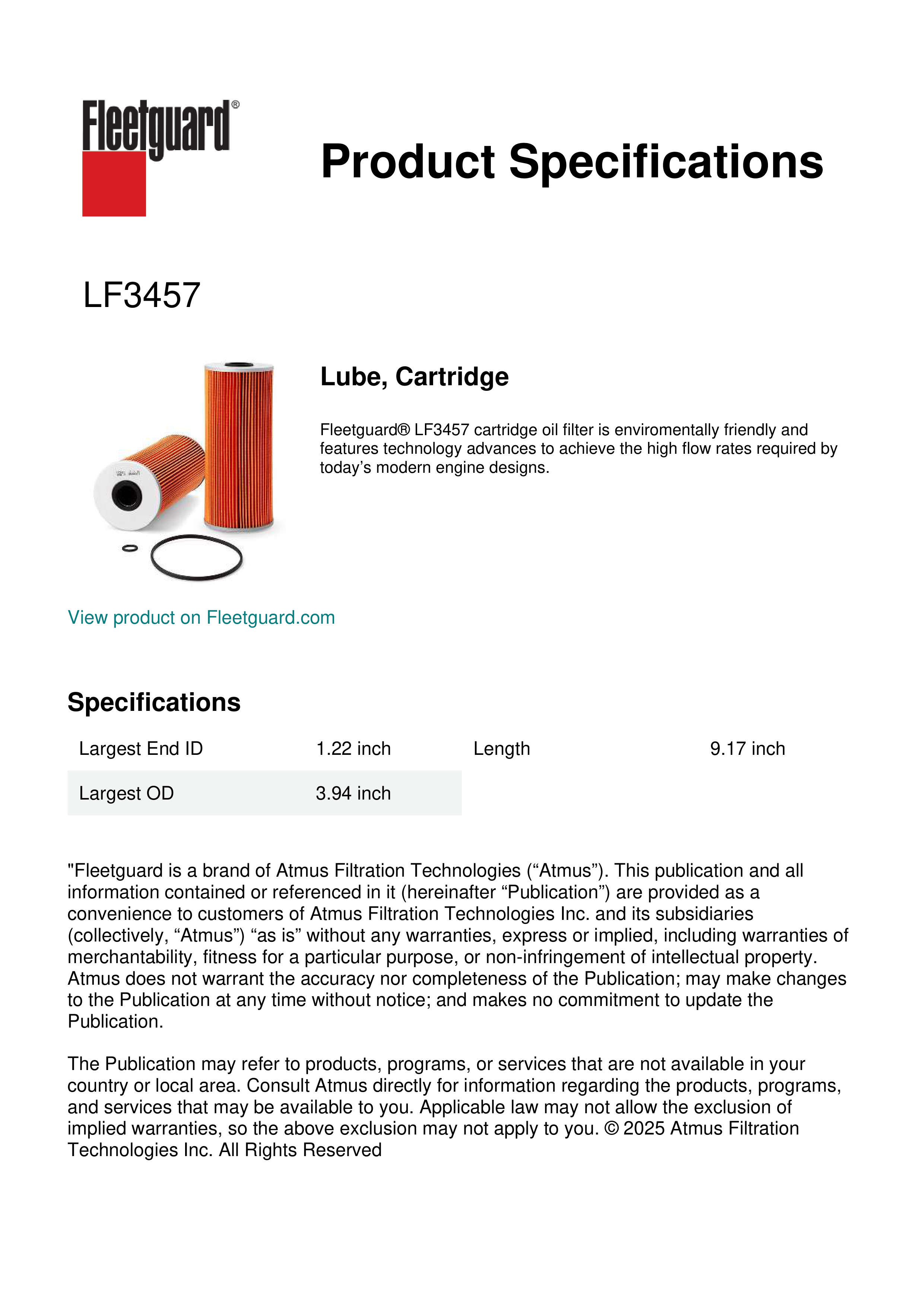 Fleetguard® LF3457 cartridge oil filter is enviromentally friendly and features technology advances to achieve the high flow rates required by today’s modern engine designs.Specification