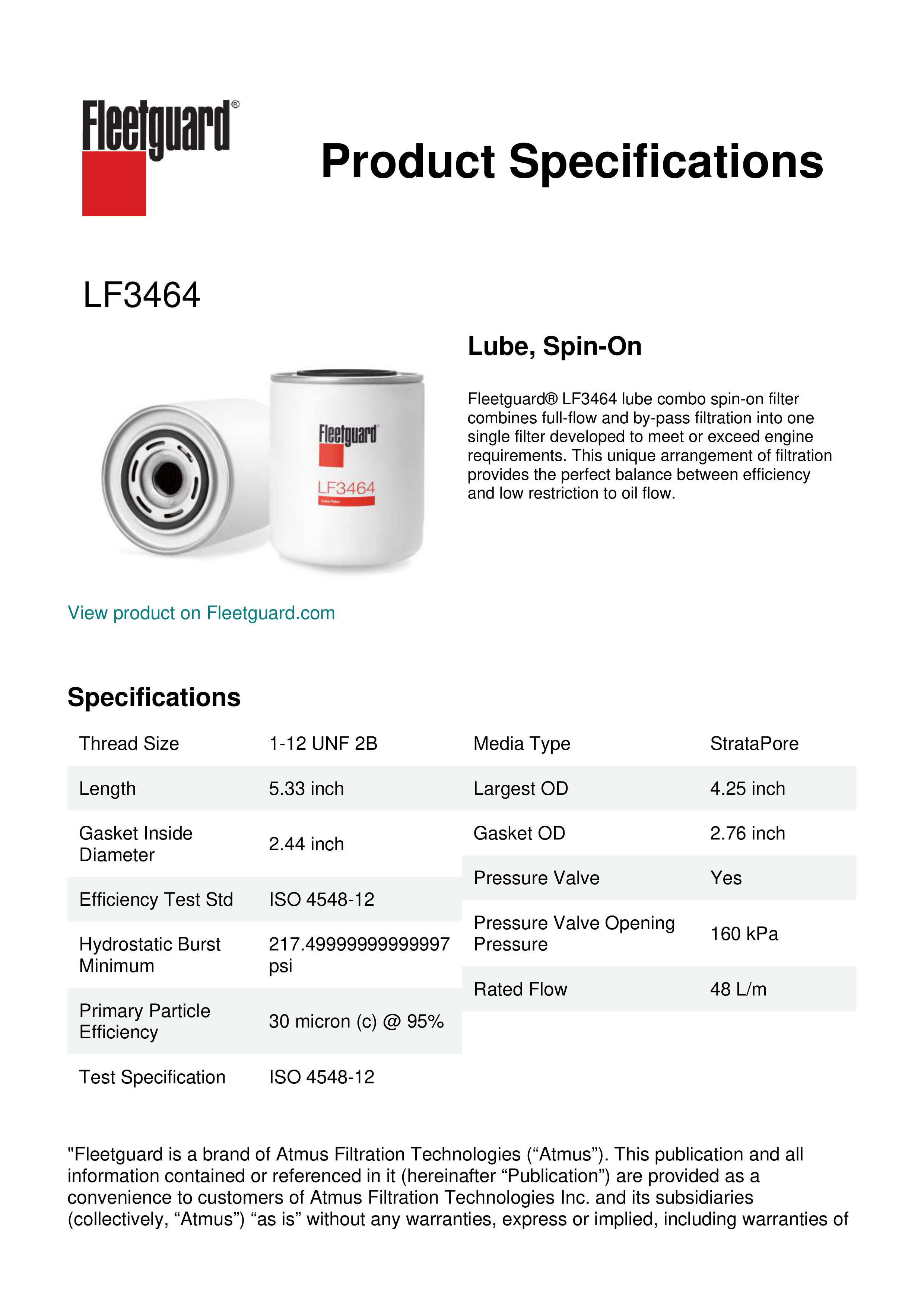 Fleetguard® LF3464 lube combo spin-on filter combines full-flow and by-pass filtration into one single filter developed to meet or exceed engine requirements. This unique arrangement of filtration provides the perfect balance between efficiency and low restriction to oil flow.Specification