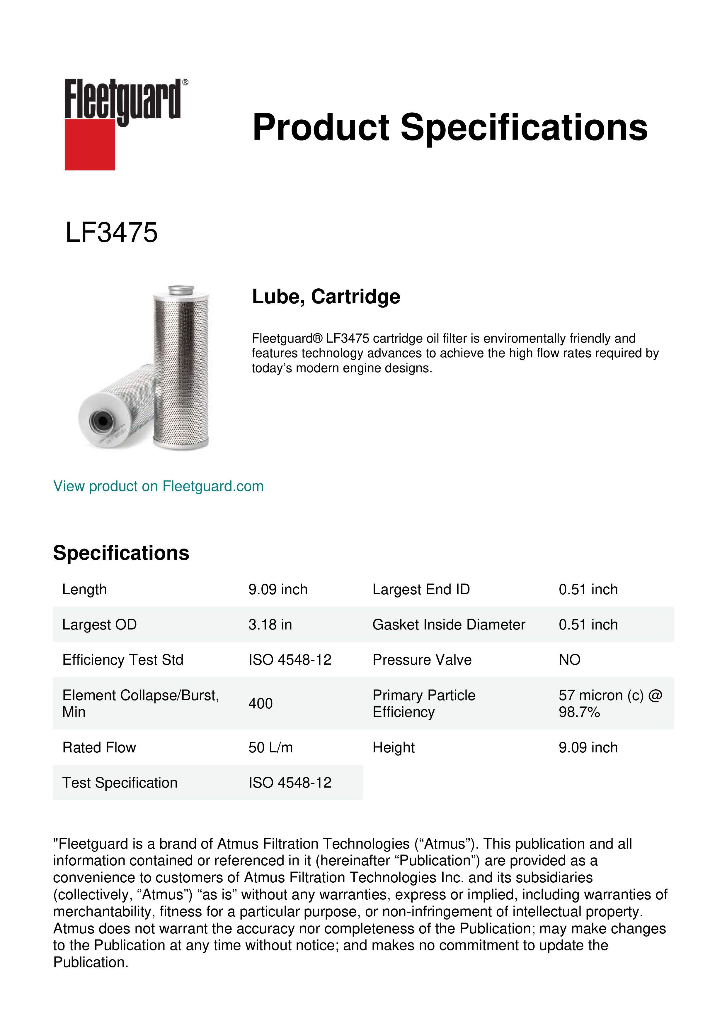 Fleetguard® LF3475 cartridge oil filter is enviromentally friendly and features technology advances to achieve the high flow rates required by today’s modern engine designs.Specification