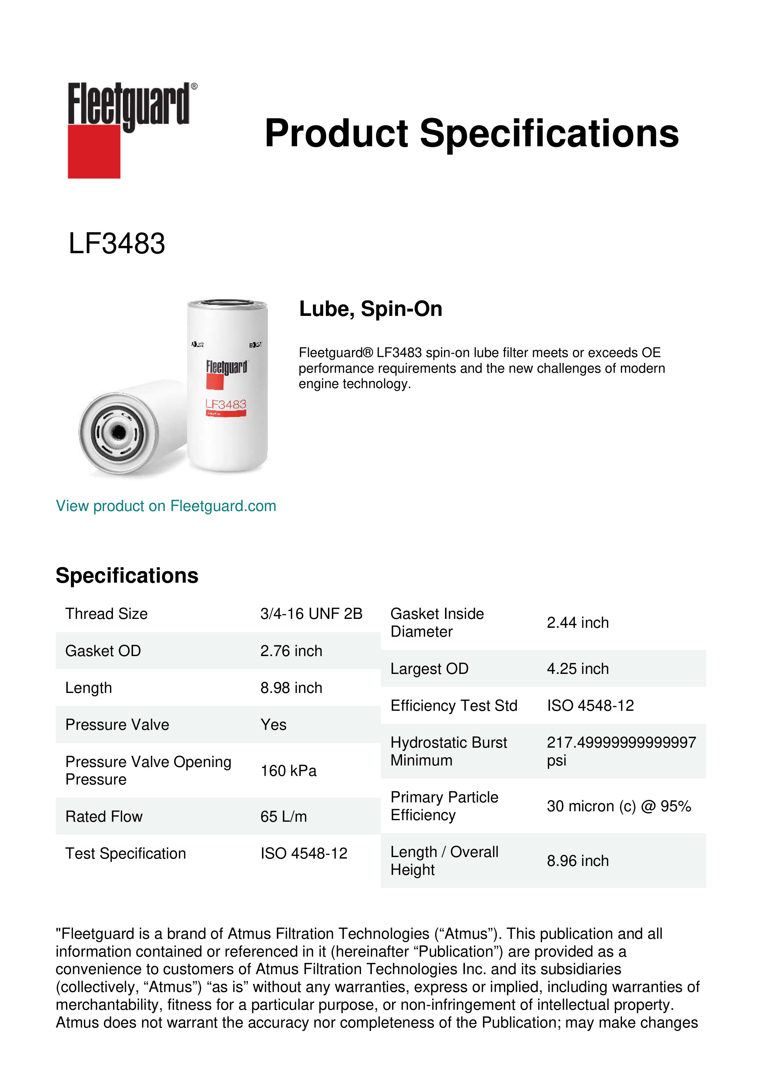 Fleetguard® LF3483 spin-on lube filter meets or exceeds OE performance requirements and the new challenges of modern engine technology.Specification