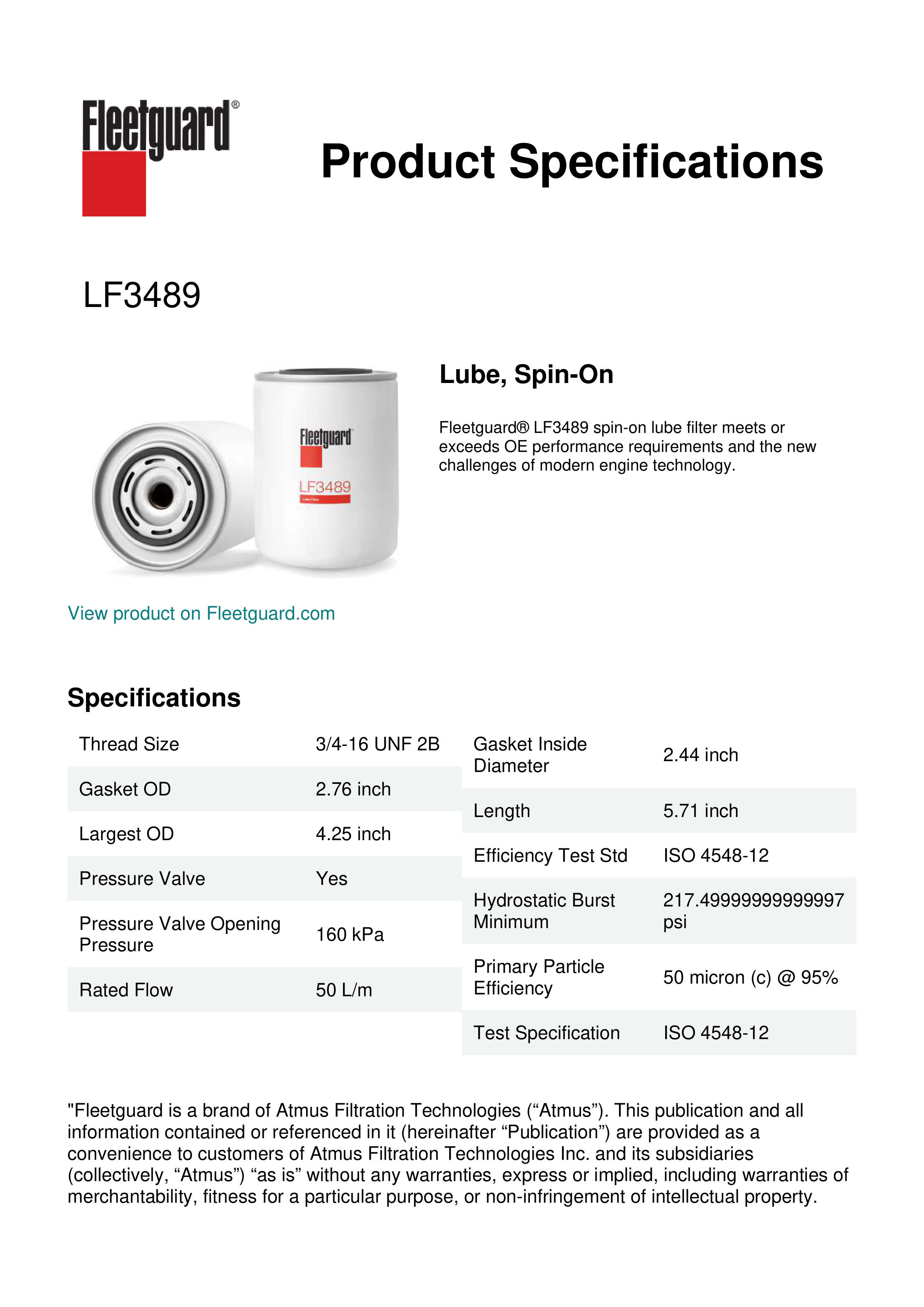 Fleetguard® LF3489 spin-on lube filter meets or exceeds OE performance requirements and the new challenges of modern engine technology.Specification