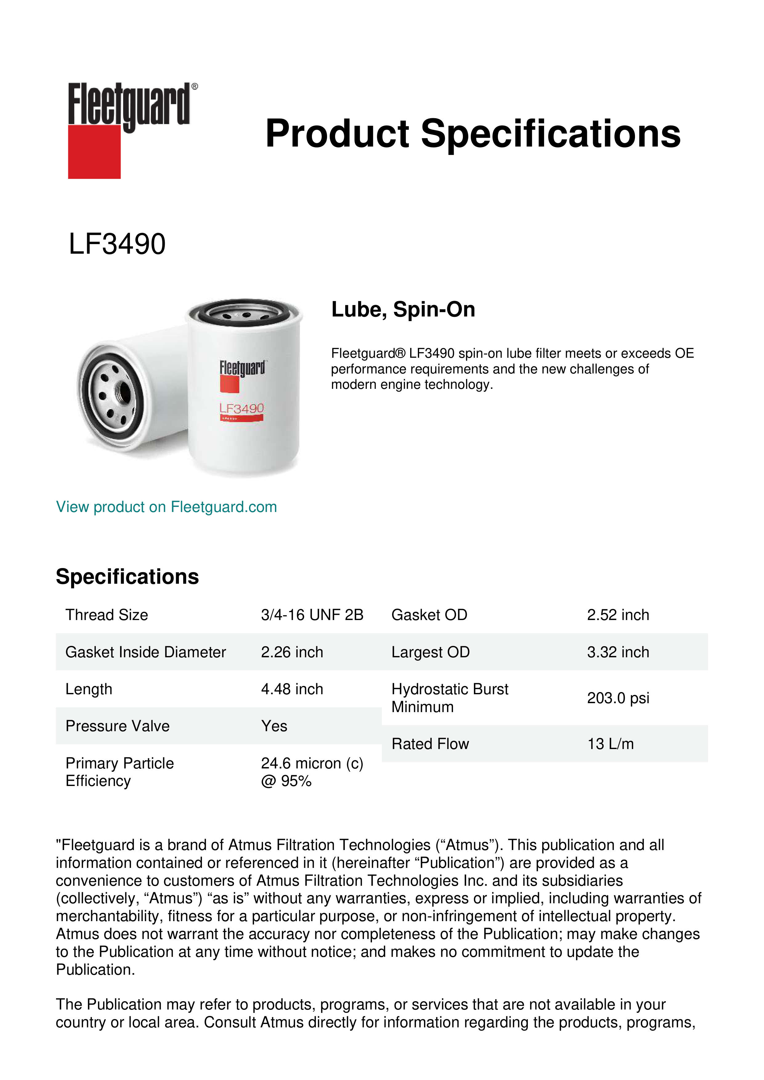 Fleetguard® LF3490 spin-on lube filter meets or exceeds OE performance requirements and the new challenges of modern engine technology.Specification