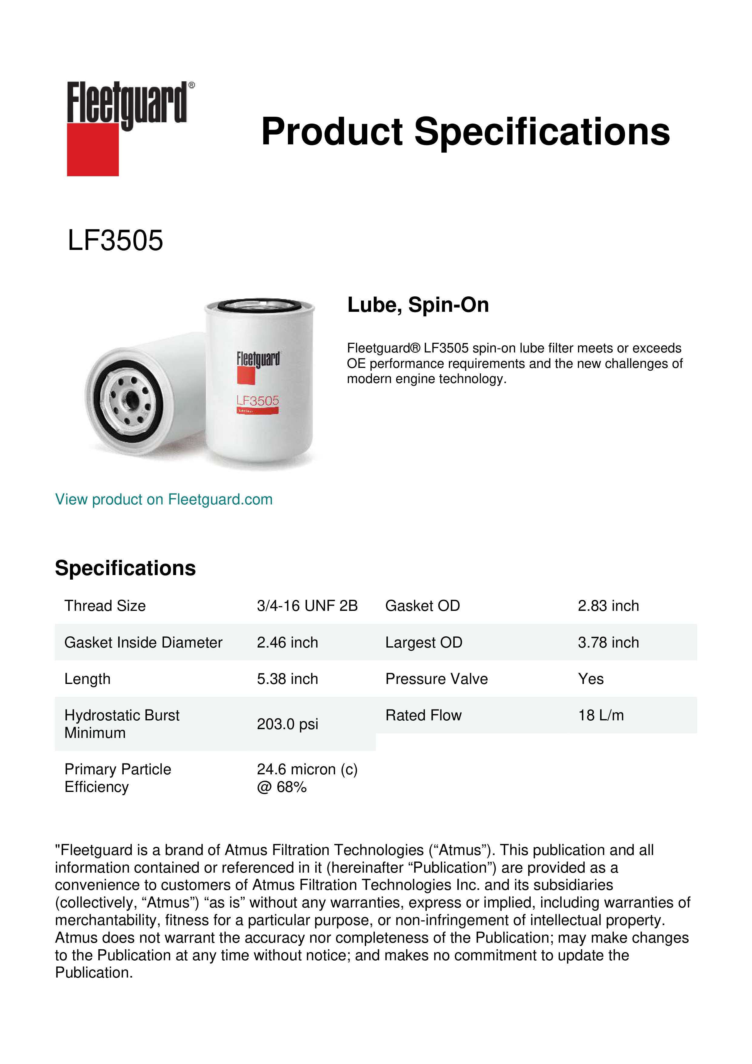 Fleetguard® LF3505 spin-on lube filter meets or exceeds OE performance requirements and the new challenges of modern engine technology.Specification