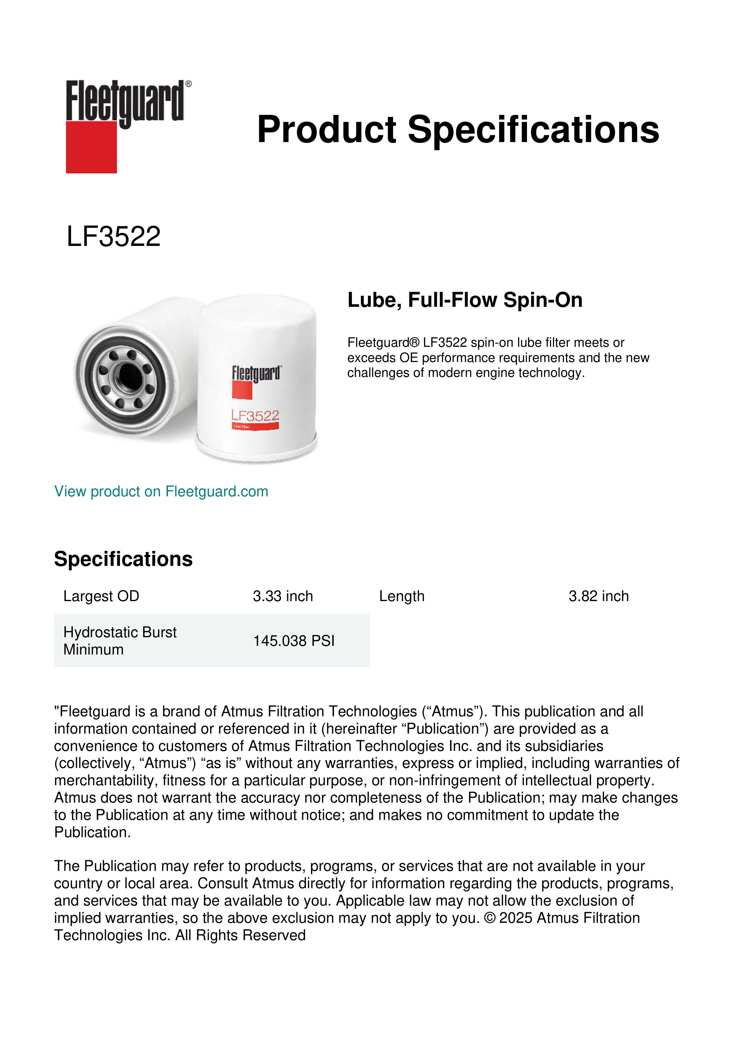 Fleetguard® LF3522 spin-on lube filter meets or exceeds OE performance requirements and the new challenges of modern engine technology.Specification