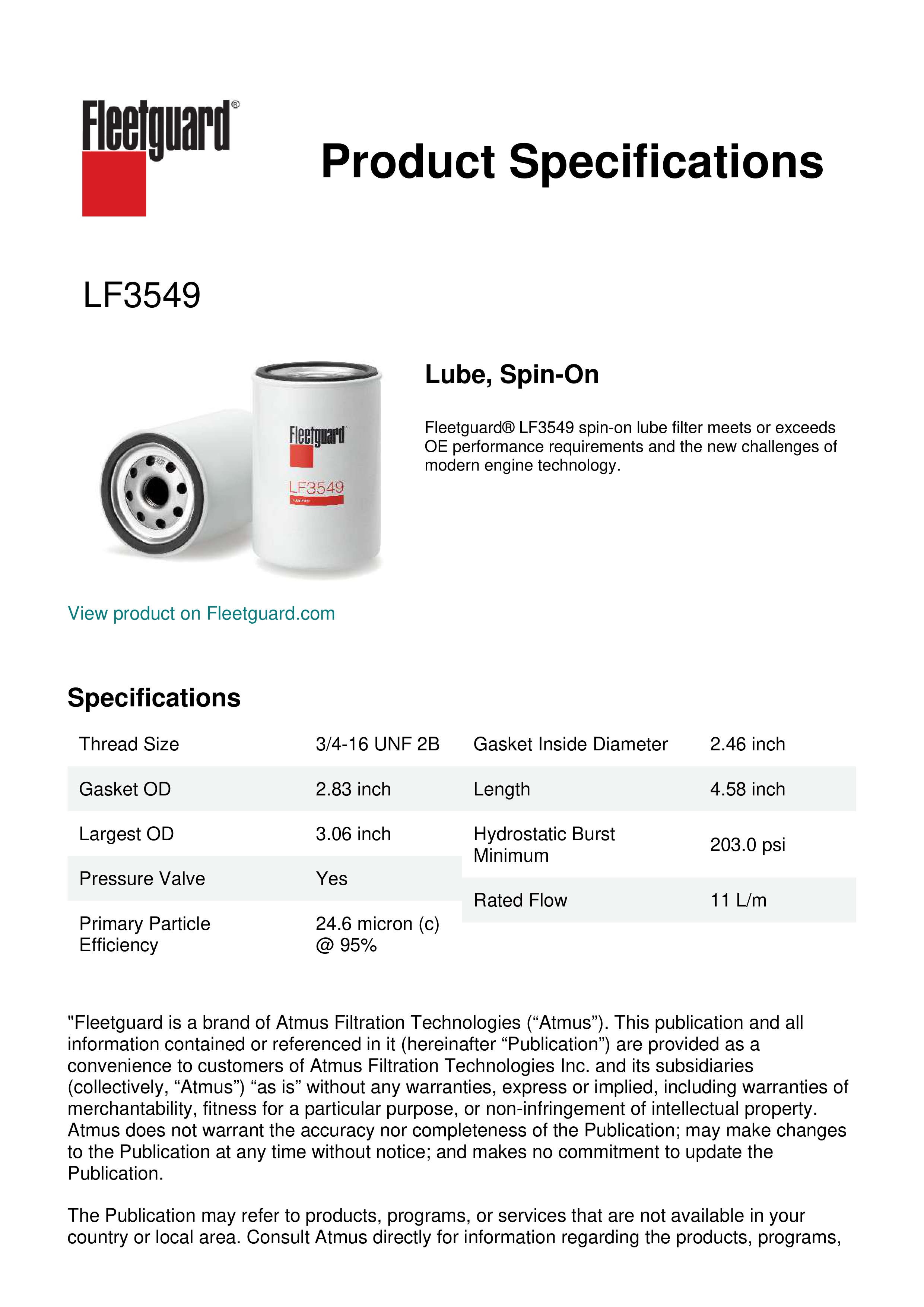 Fleetguard® LF3549 spin-on lube filter meets or exceeds OE performance requirements and the new challenges of modern engine technology.Specification