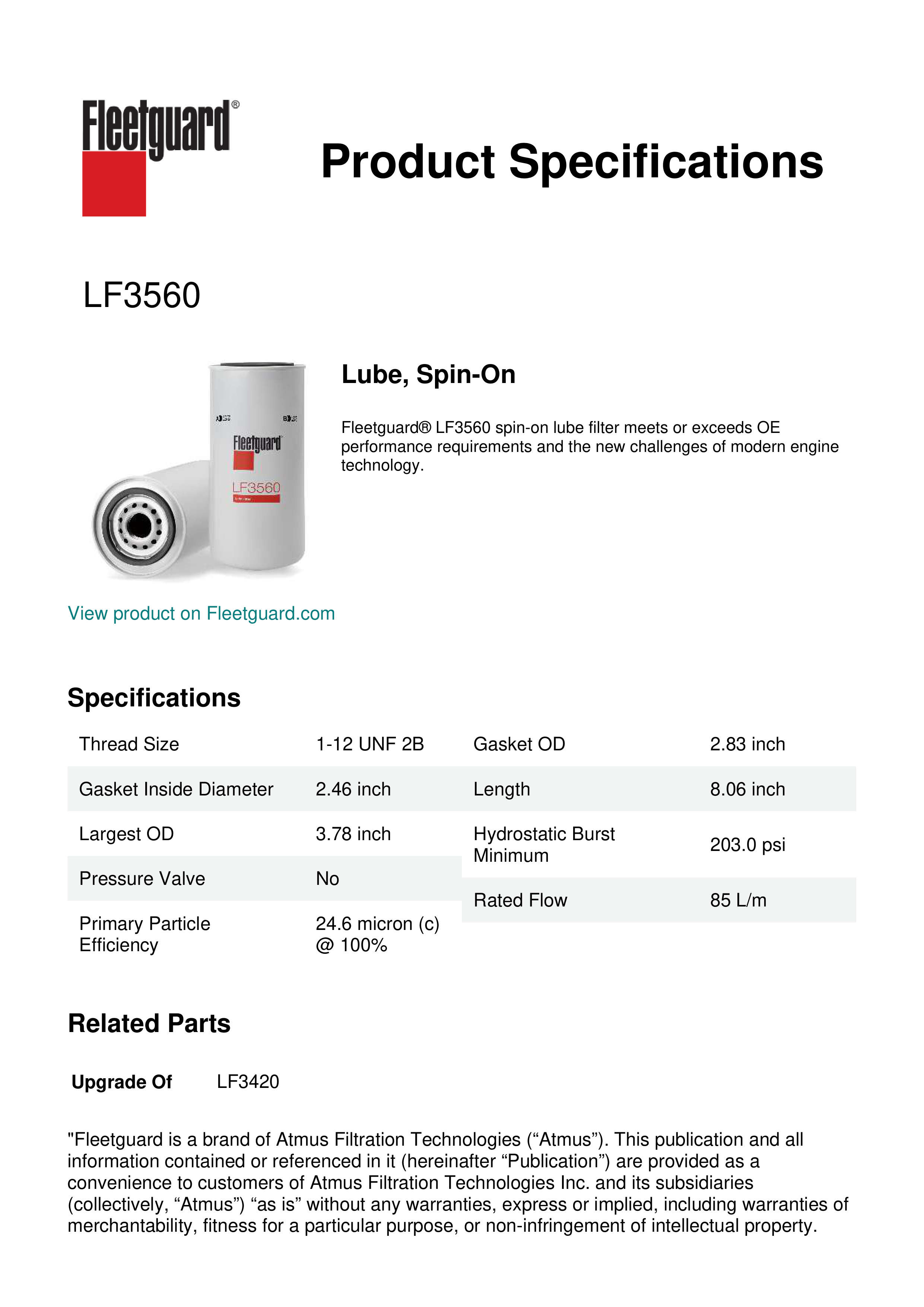 Fleetguard® LF3560 spin-on lube filter meets or exceeds OE performance requirements and the new challenges of modern engine technology.Specification