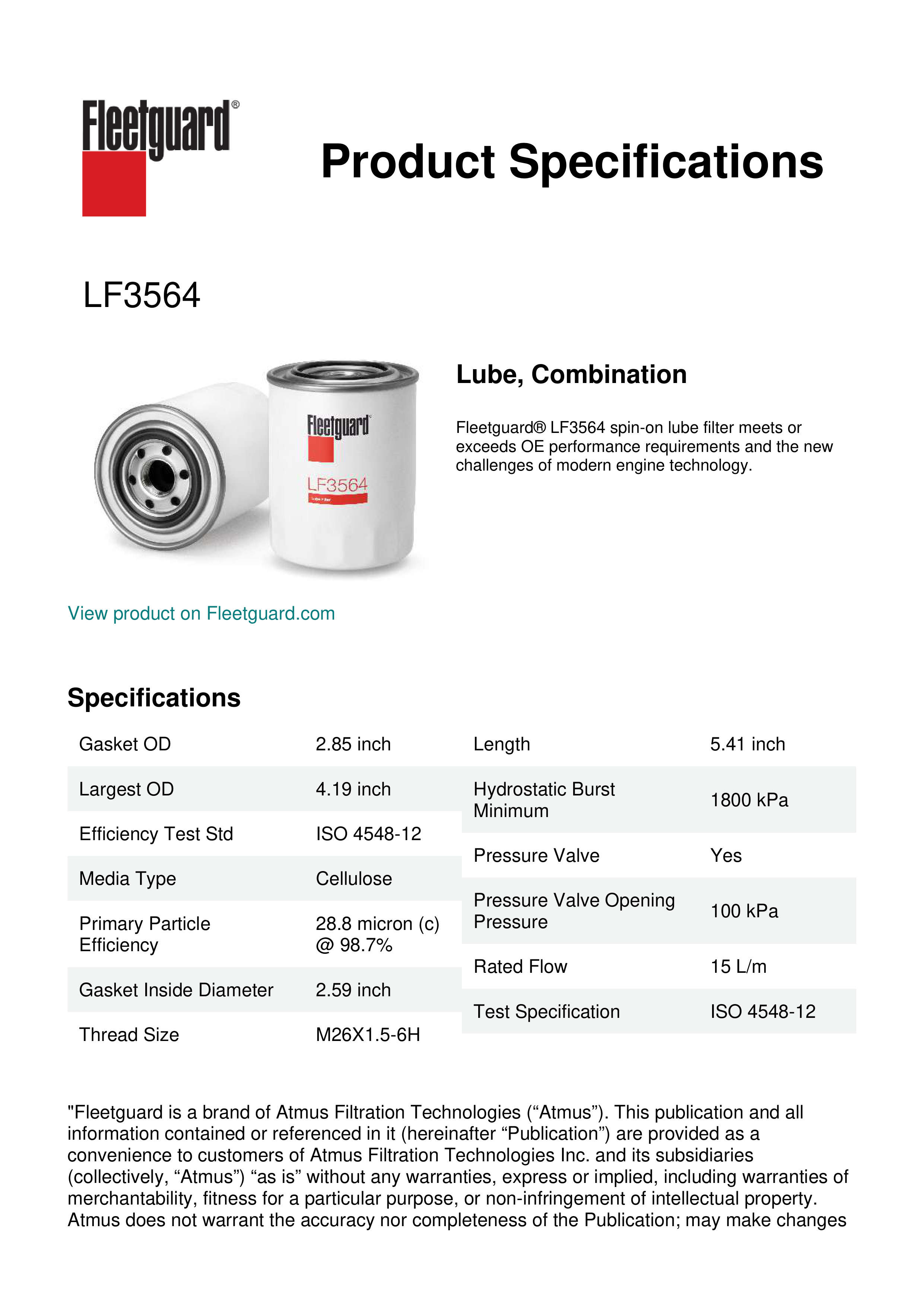 Fleetguard® LF3564 spin-on lube filter meets or exceeds OE performance requirements and the new challenges of modern engine technology.Specification