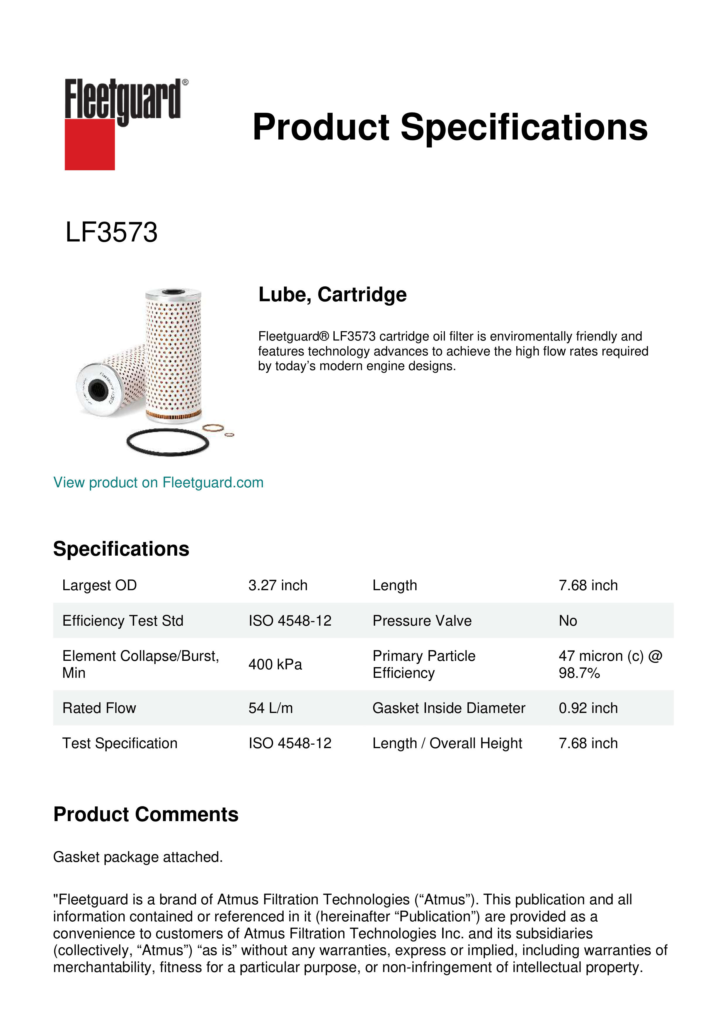 Fleetguard® LF3573 cartridge oil filter is enviromentally friendly and features technology advances to achieve the high flow rates required by today’s modern engine designs.Specification
