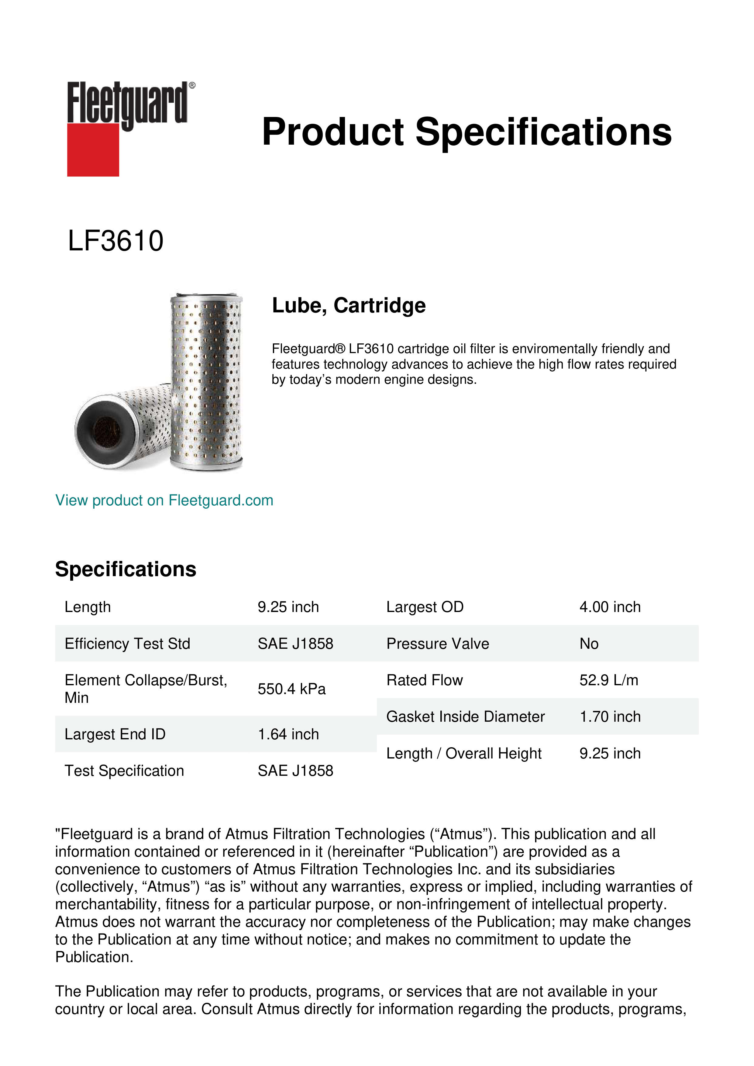 Fleetguard® LF3610 cartridge oil filter is enviromentally friendly and features technology advances to achieve the high flow rates required by today’s modern engine designs.Specification