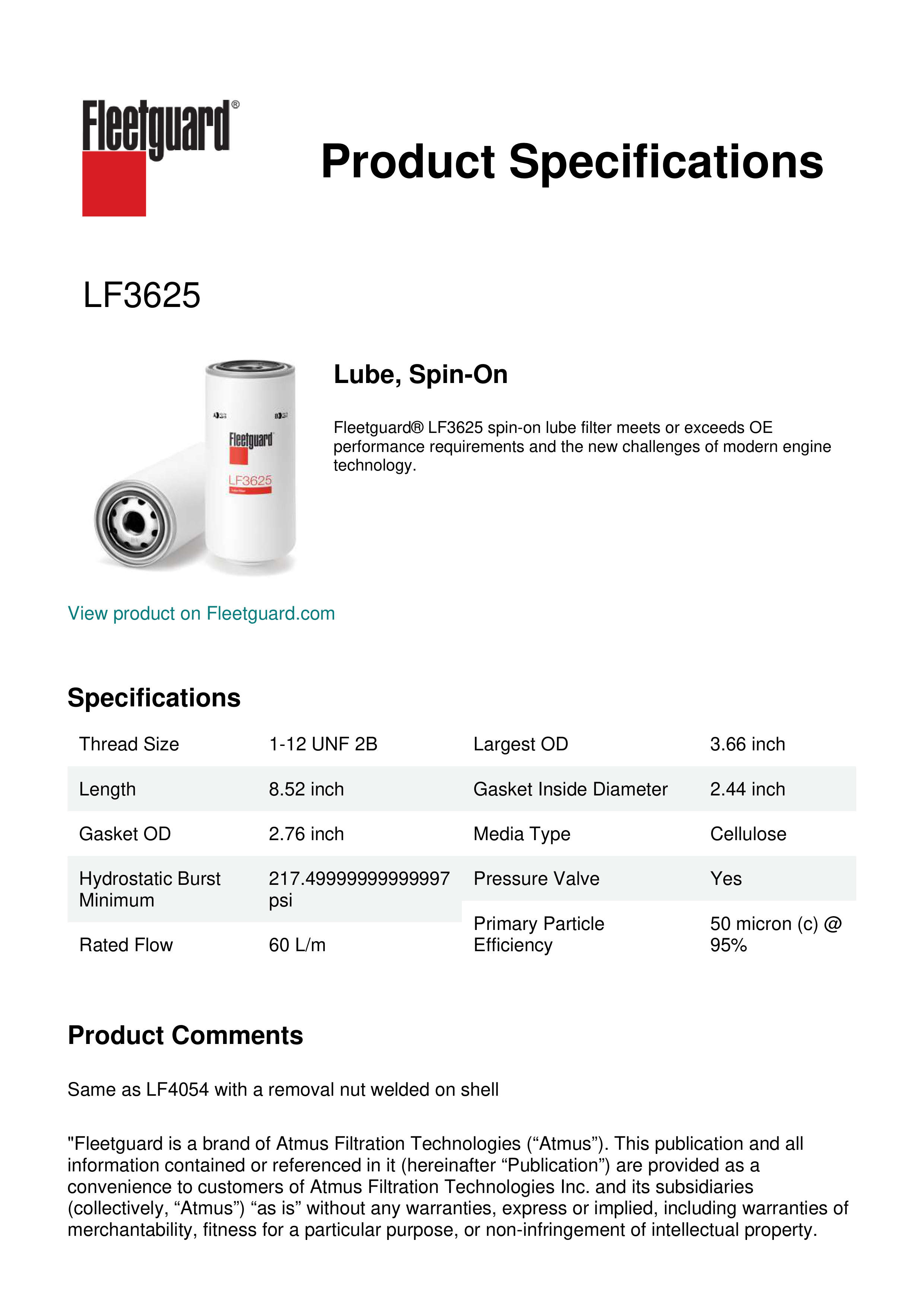 Fleetguard® LF3625 spin-on lube filter meets or exceeds OE performance requirements and the new challenges of modern engine technology.Specification