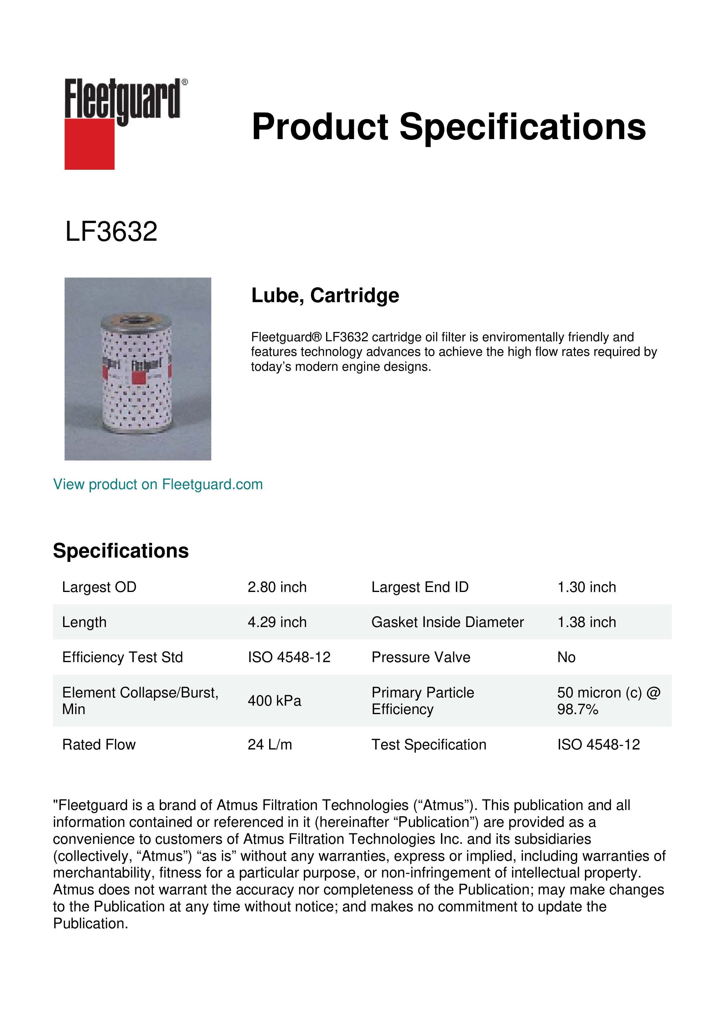Fleetguard® LF3632 cartridge oil filter is enviromentally friendly and features technology advances to achieve the high flow rates required by today’s modern engine designs.Specification