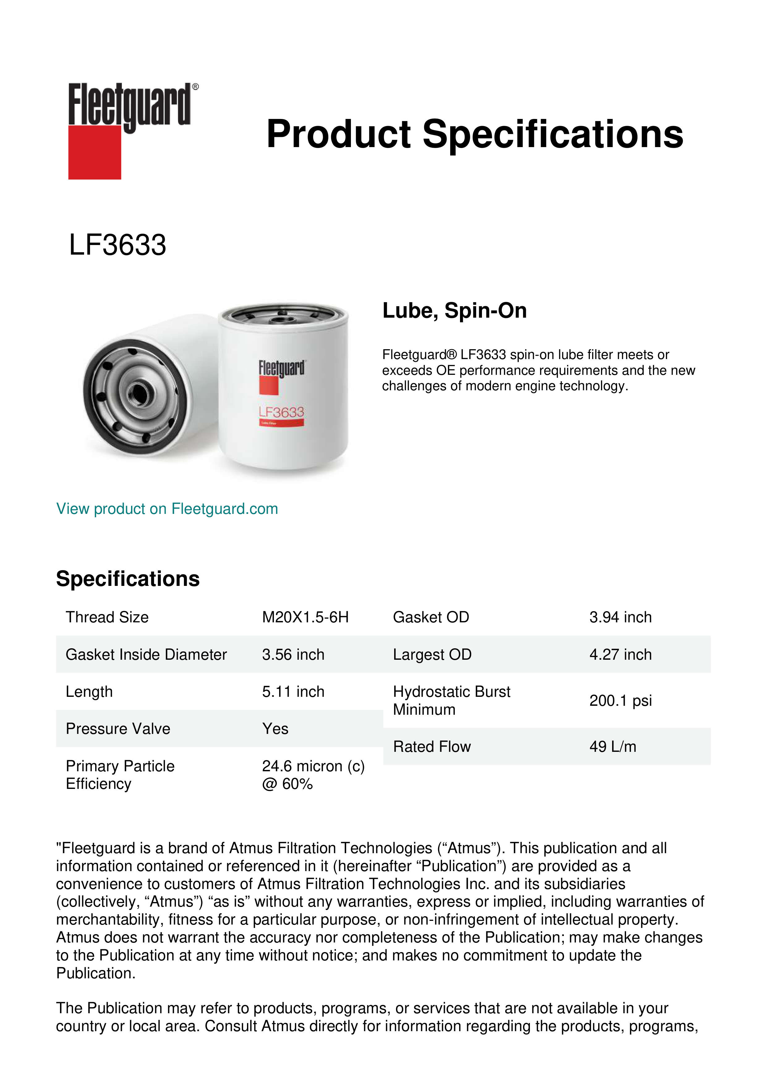 Fleetguard® LF3633 spin-on lube filter meets or exceeds OE performance requirements and the new challenges of modern engine technology.Specification