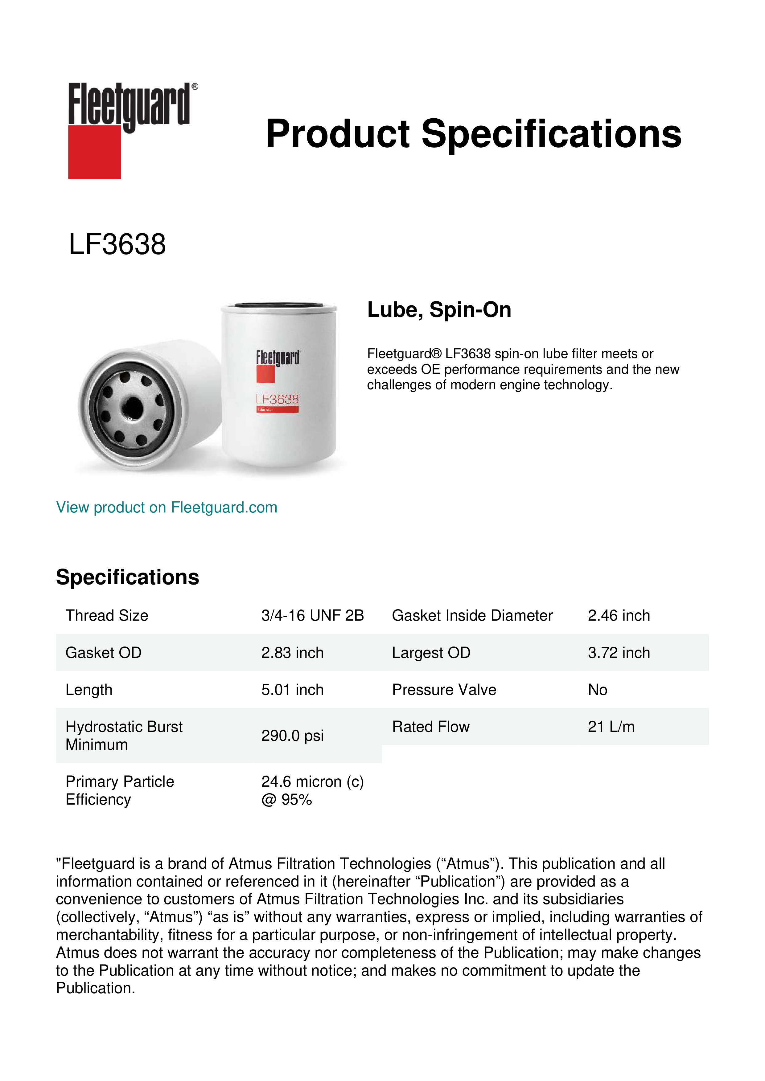 Fleetguard® LF3638 spin-on lube filter meets or exceeds OE performance requirements and the new challenges of modern engine technology.Specification
