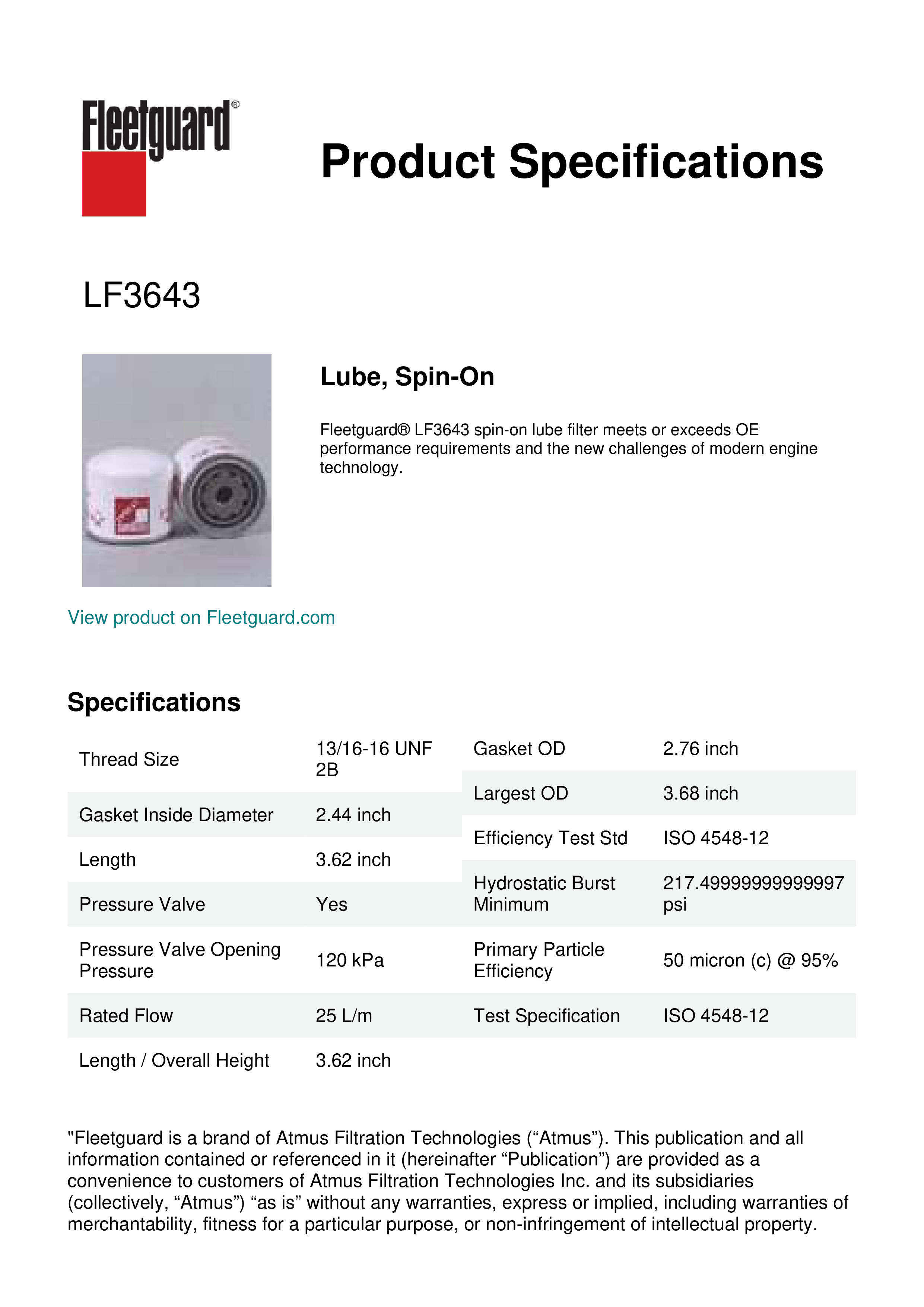 Fleetguard® LF3643 spin-on lube filter meets or exceeds OE performance requirements and the new challenges of modern engine technology.Specification