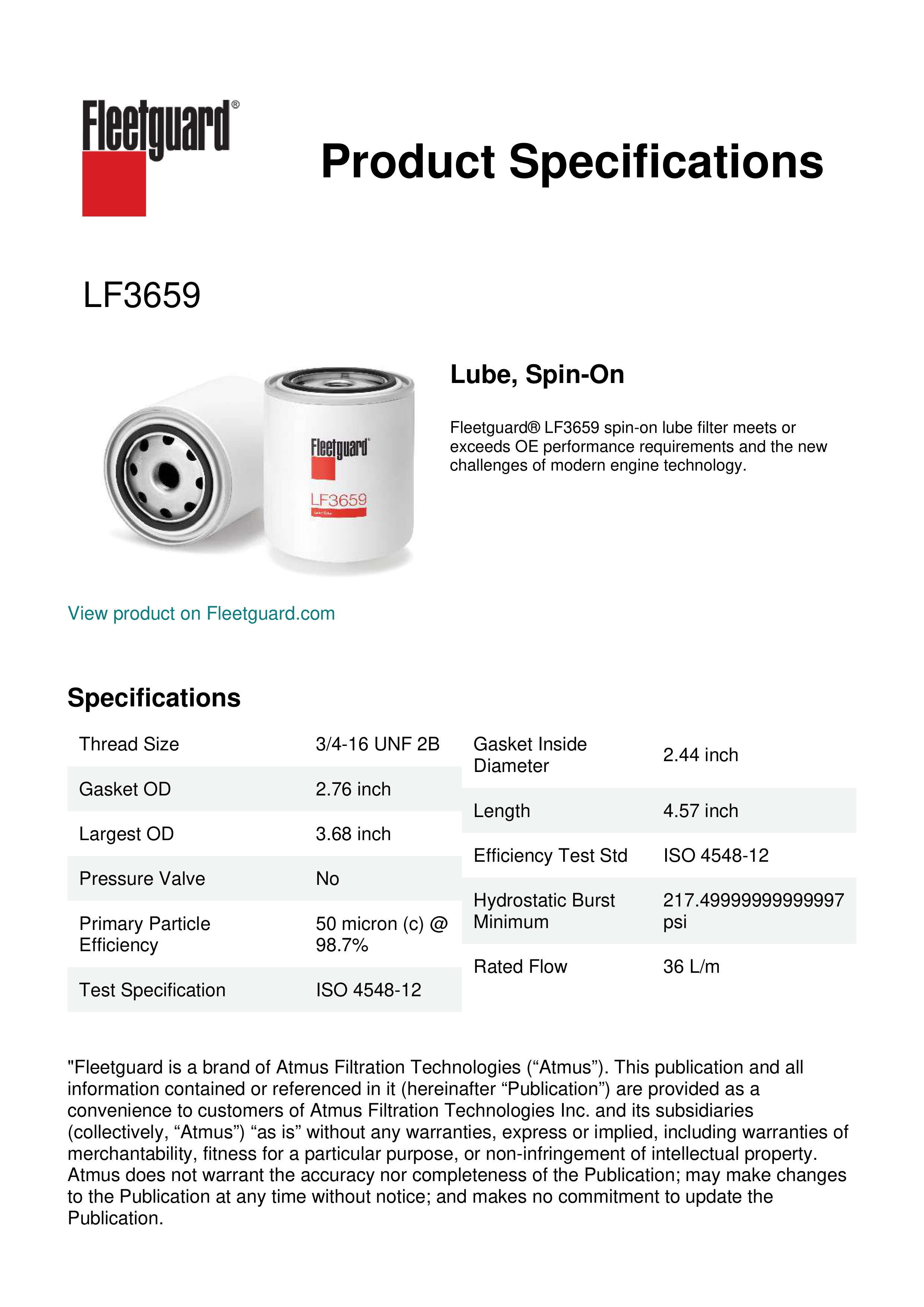 Fleetguard® LF3659 spin-on lube filter meets or exceeds OE performance requirements and the new challenges of modern engine technology.Specification
