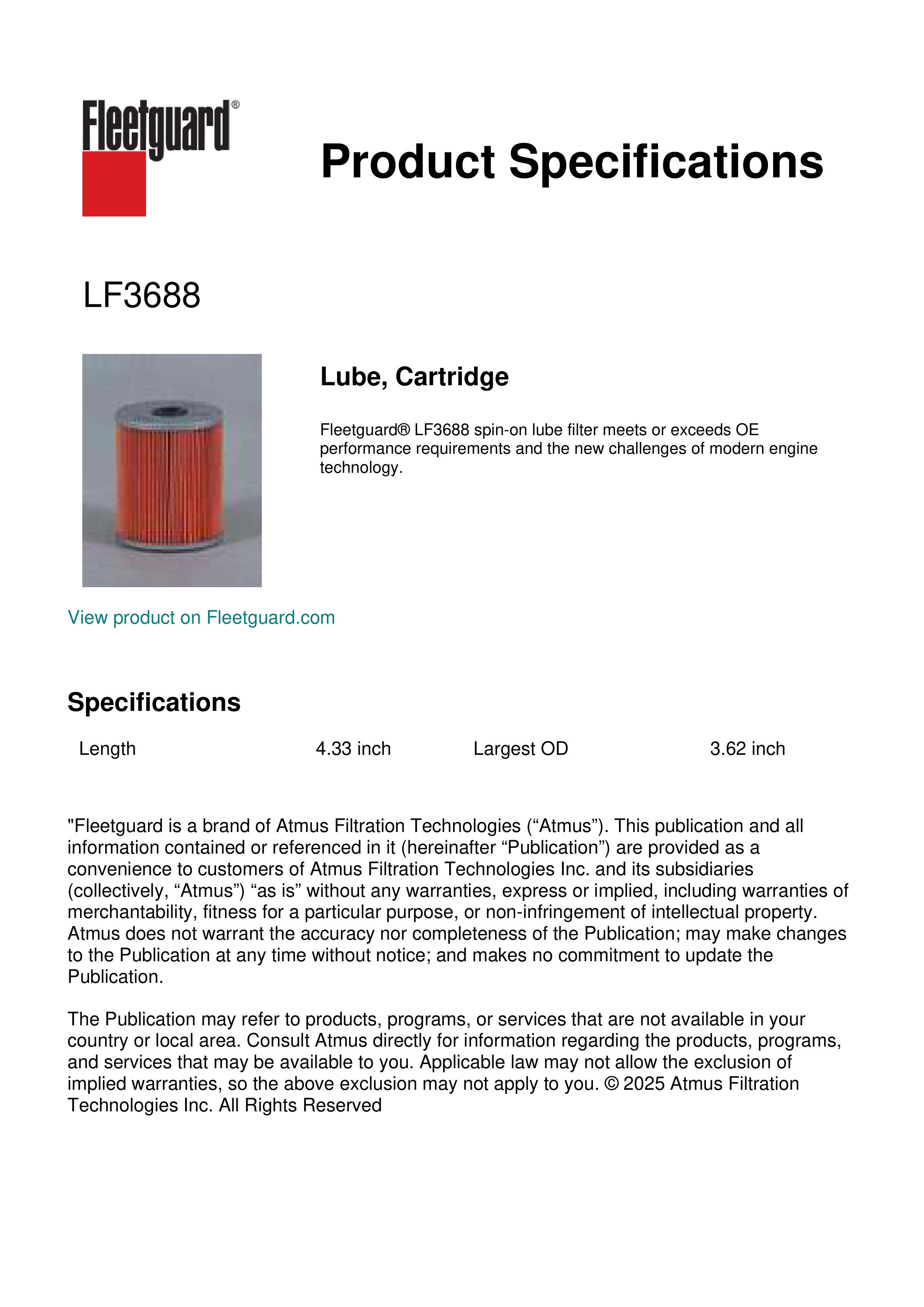 Fleetguard® LF3688 spin-on lube filter meets or exceeds OE performance requirements and the new challenges of modern engine technology.Specification