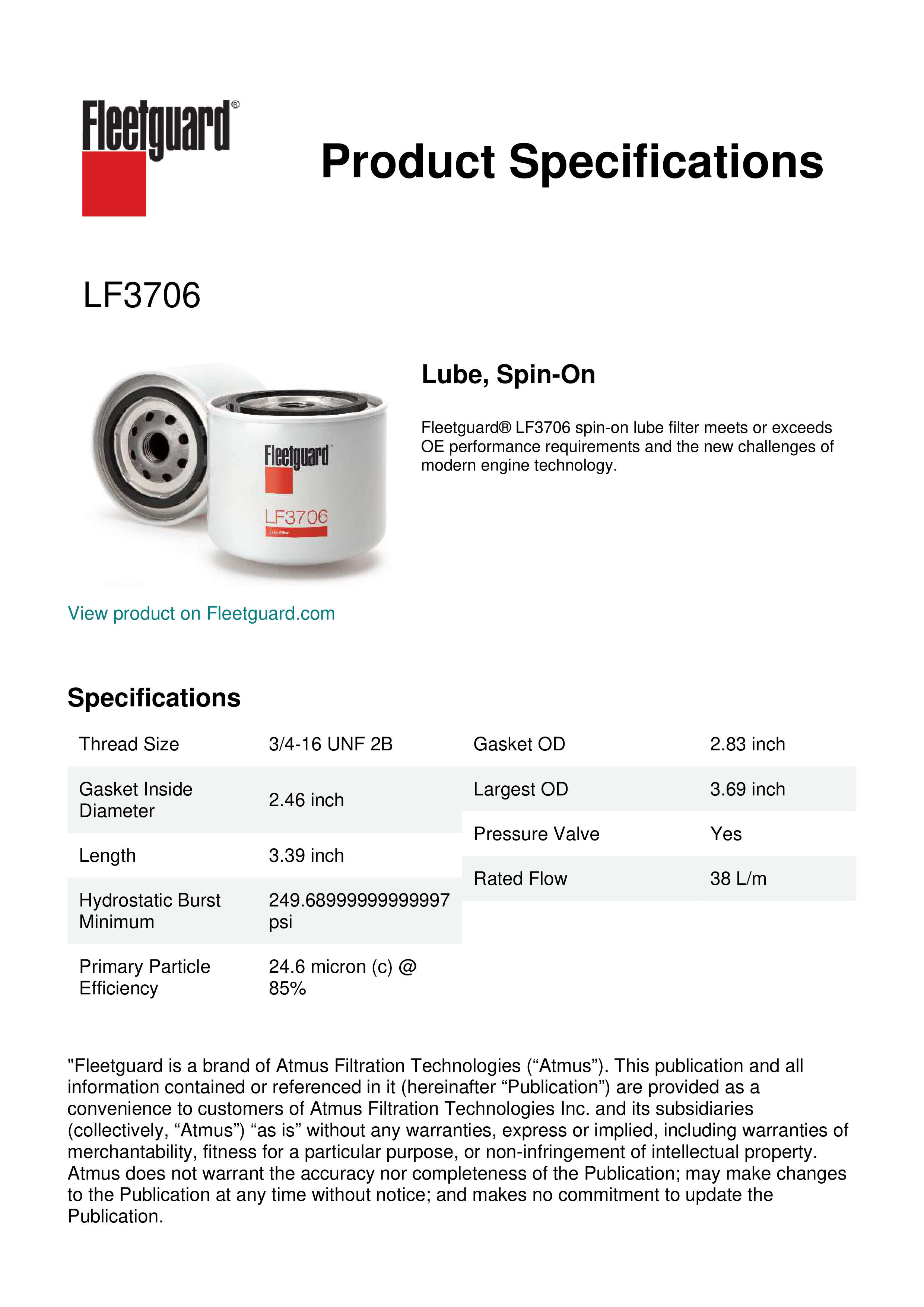 Fleetguard® LF3706 spin-on lube filter meets or exceeds OE performance requirements and the new challenges of modern engine technology.Specification