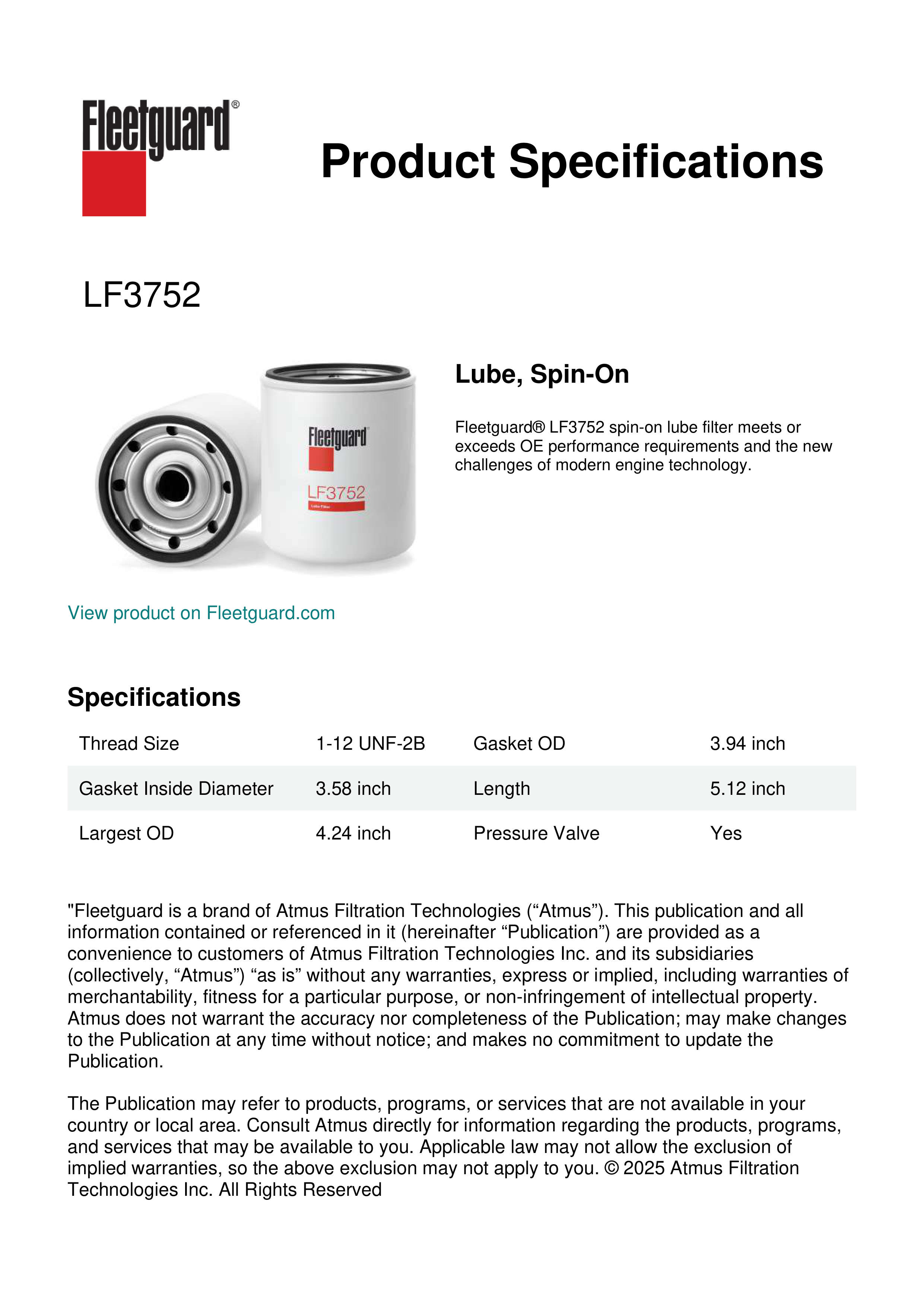 Fleetguard® LF3752 spin-on lube filter meets or exceeds OE performance requirements and the new challenges of modern engine technology.Specification