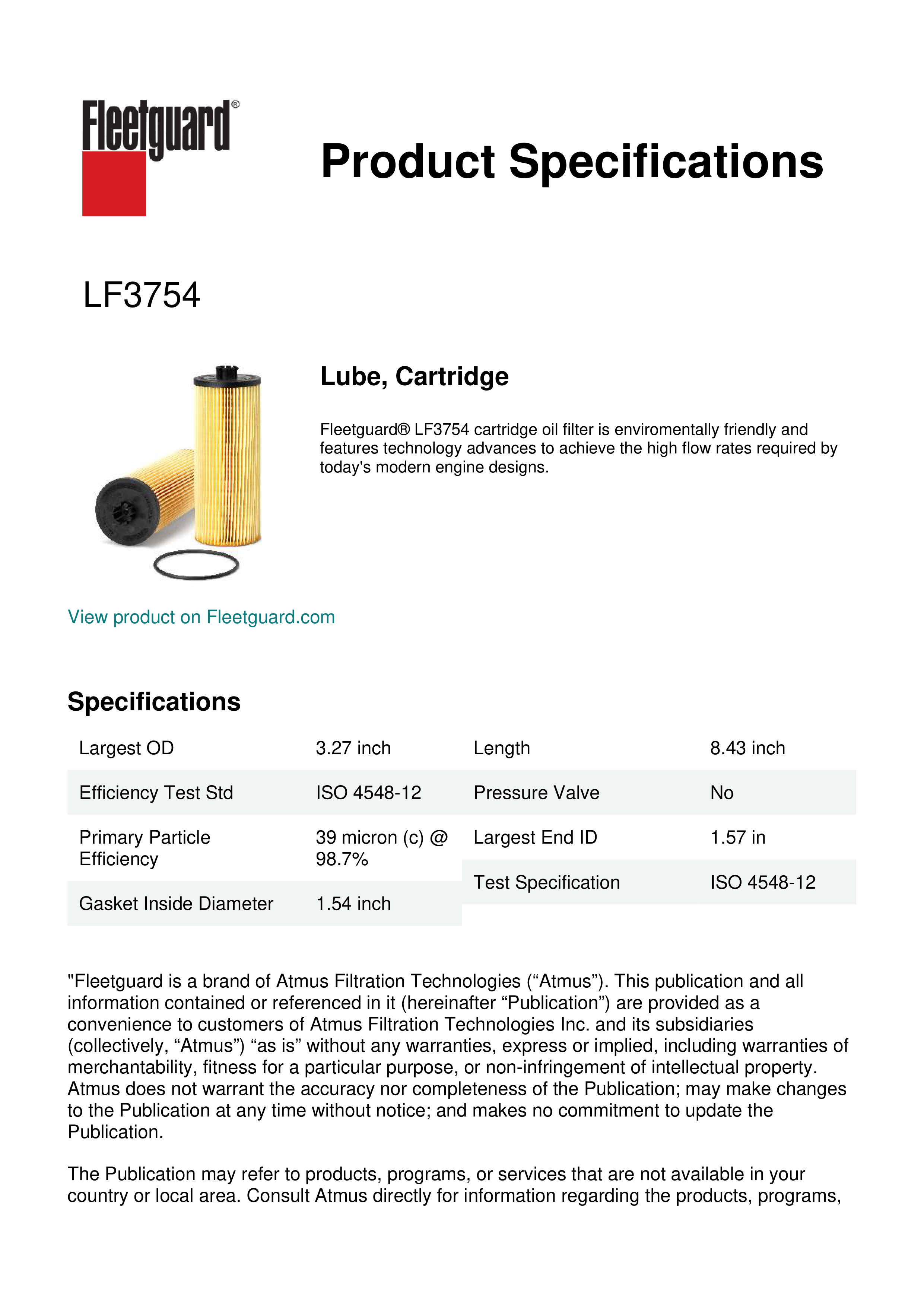 Fleetguard® LF3754 cartridge oil filter is enviromentally friendly and features technology advances to achieve the high flow rates required by today's modern engine designs.Specification