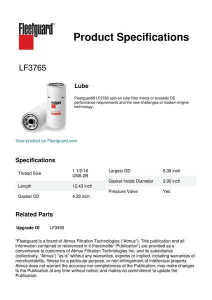 Fleetguard® LF3765 spin-on lube filter meets or exceeds OE performance requirements and the new challenges of modern engine technology.Specification