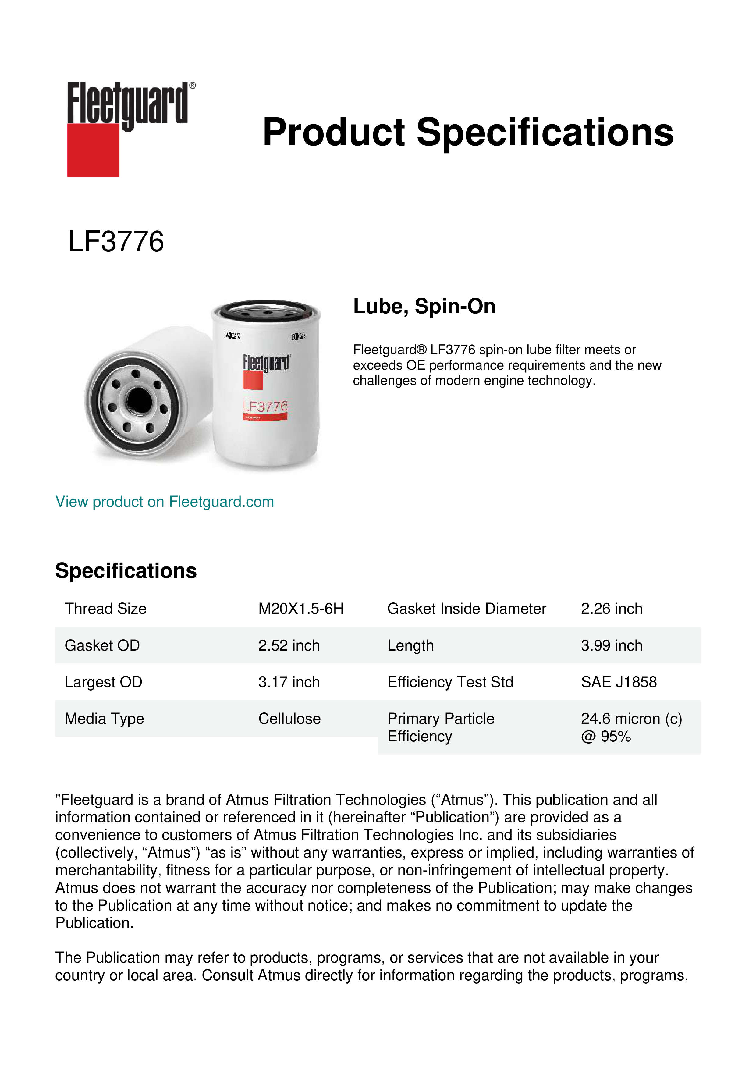 Fleetguard® LF3776 spin-on lube filter meets or exceeds OE performance requirements and the new challenges of modern engine technology.Specification