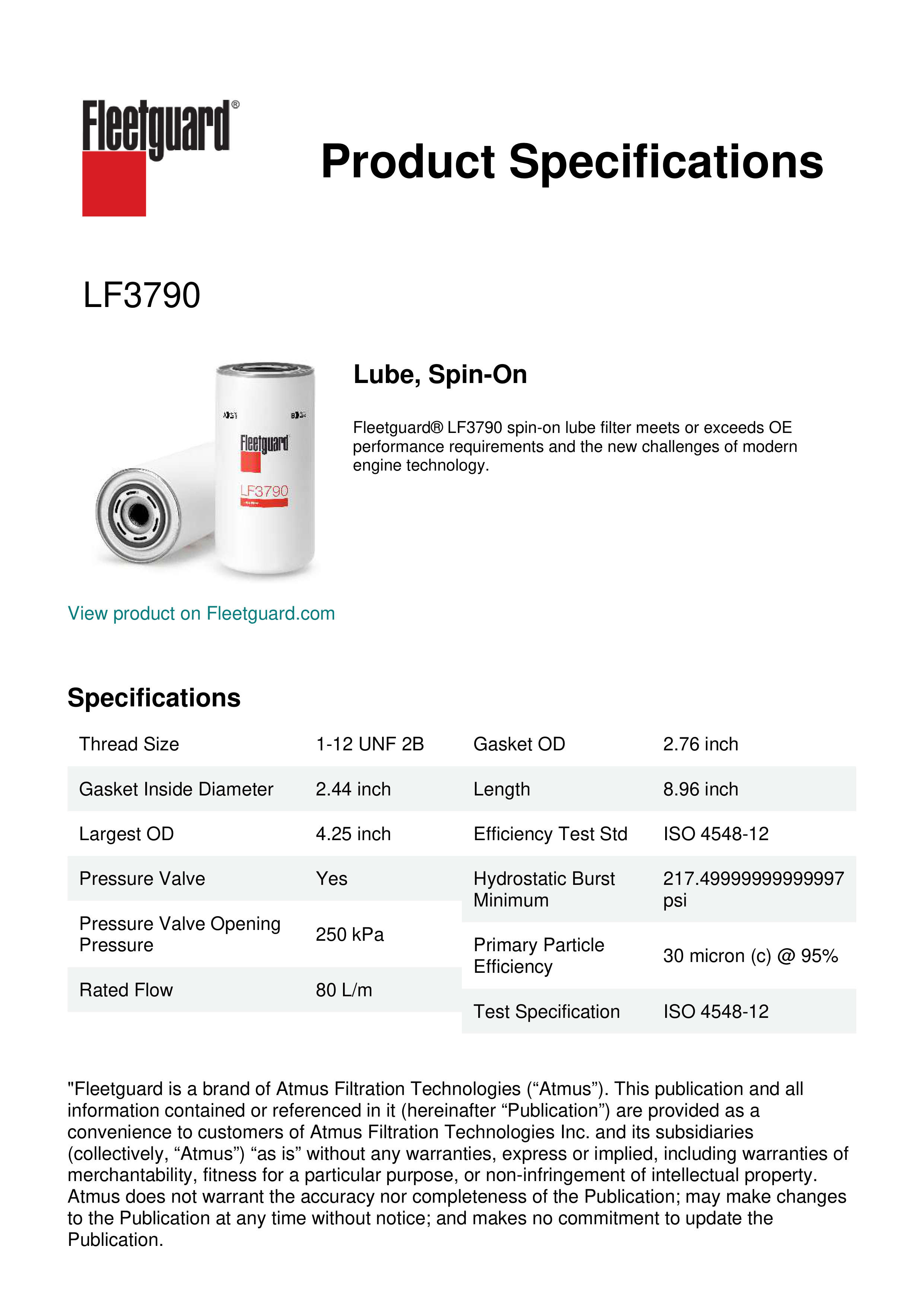 Fleetguard® LF3790 spin-on lube filter meets or exceeds OE performance requirements and the new challenges of modern engine technology.Specification
