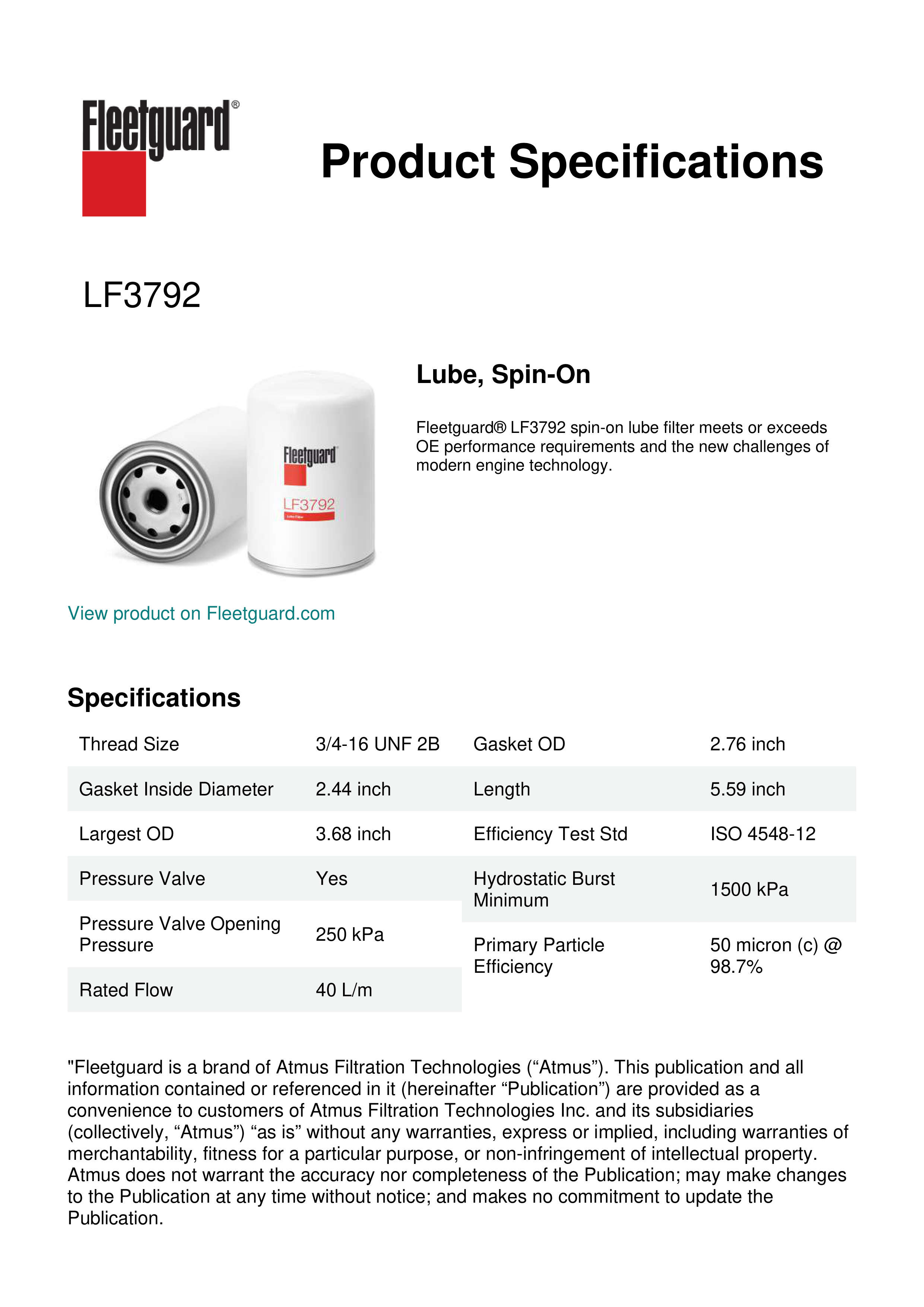 Fleetguard® LF3792 spin-on lube filter meets or exceeds OE performance requirements and the new challenges of modern engine technology.Specification