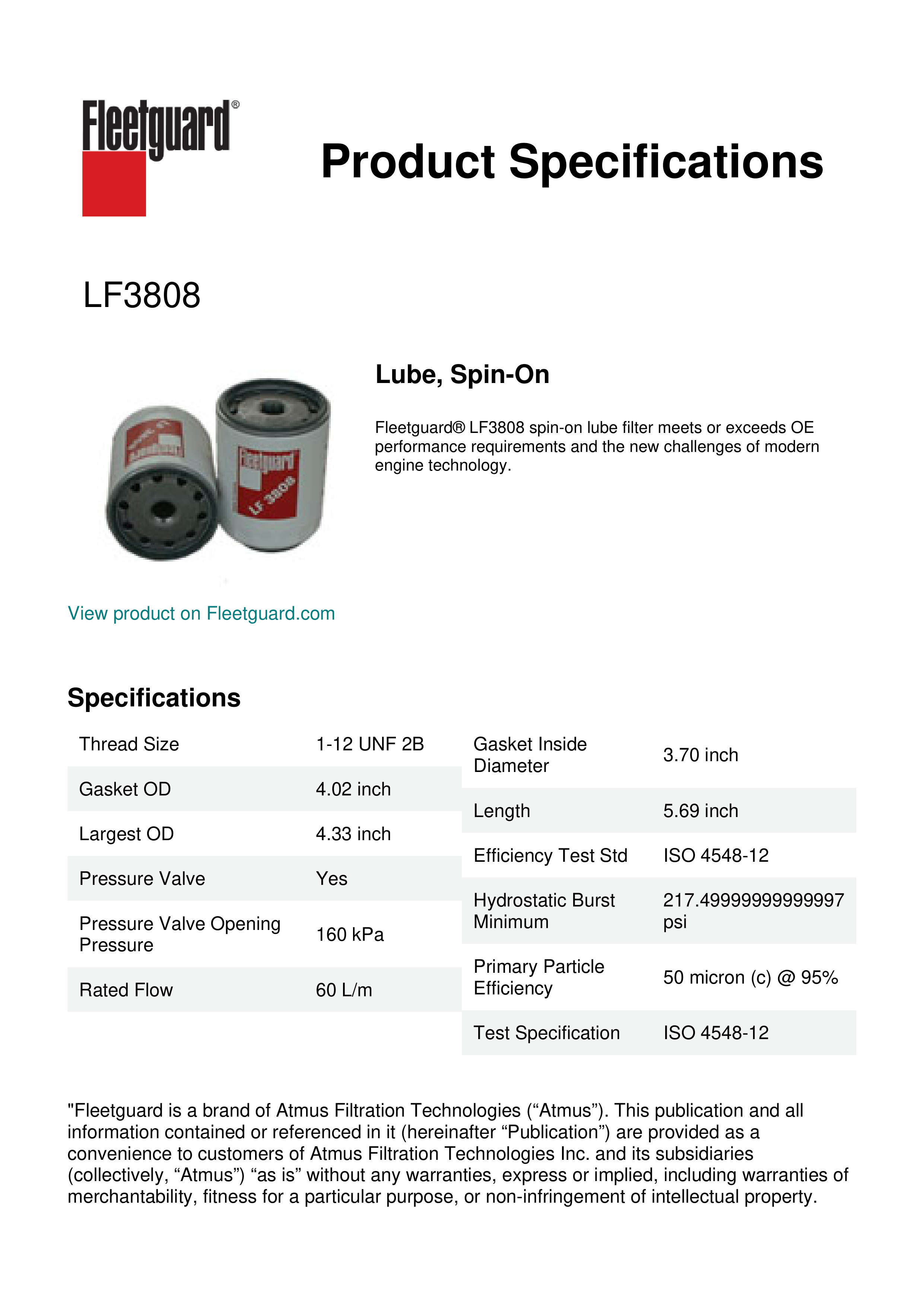 Fleetguard® LF3808 spin-on lube filter meets or exceeds OE performance requirements and the new challenges of modern engine technology.Specification