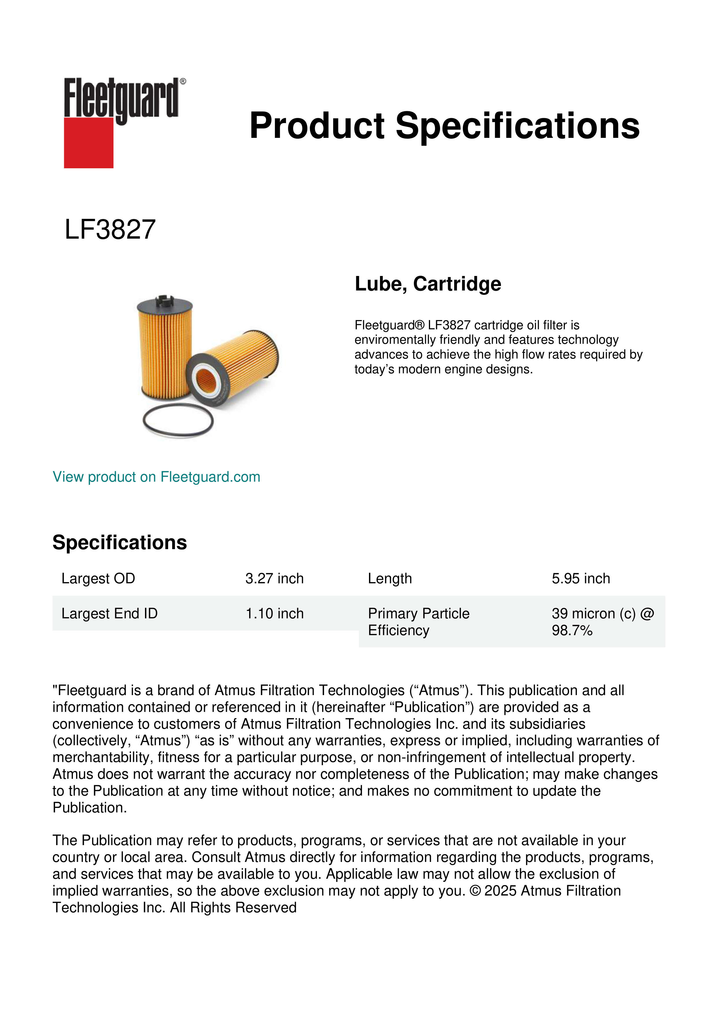 Fleetguard® LF3827 cartridge oil filter is enviromentally friendly and features technology advances to achieve the high flow rates required by today’s modern engine designs.Specification