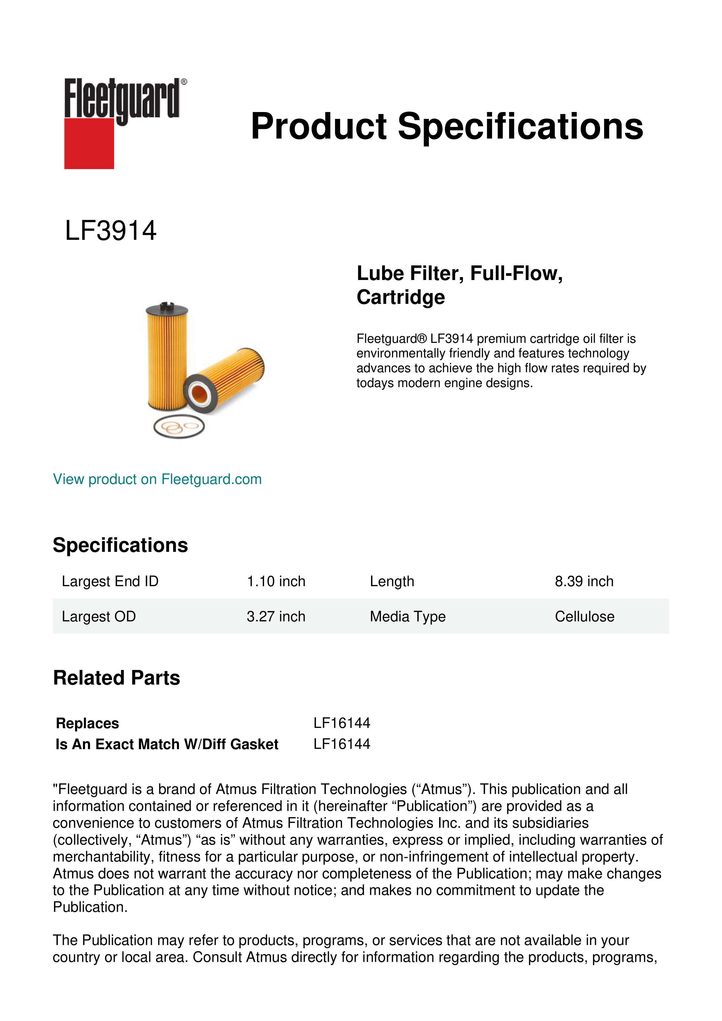 Fleetguard LF3914 Replacement Lube, Full-Flow Cartridge