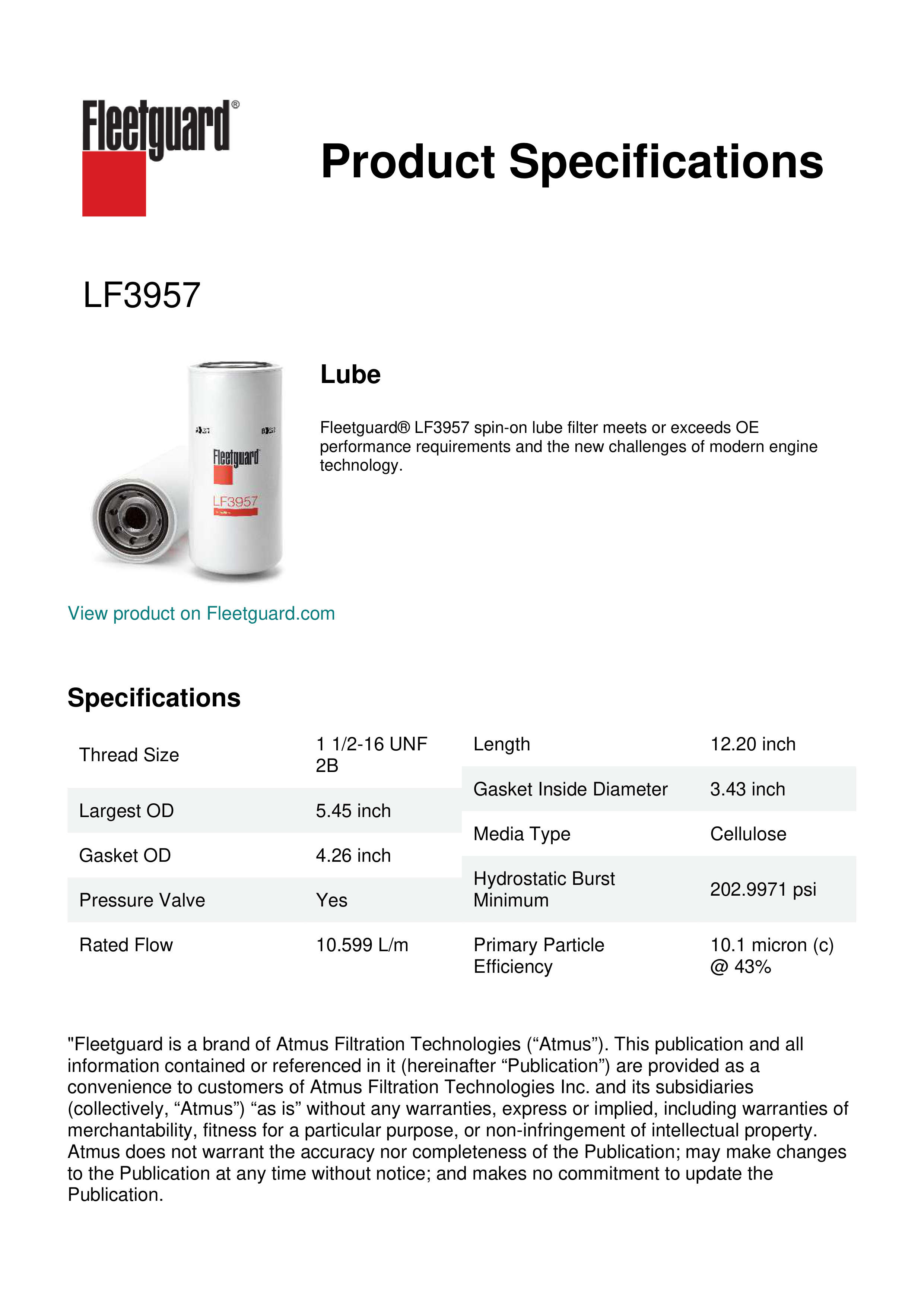 Fleetguard® LF3957 spin-on lube filter meets or exceeds OE performance requirements and the new challenges of modern engine technology.Specification