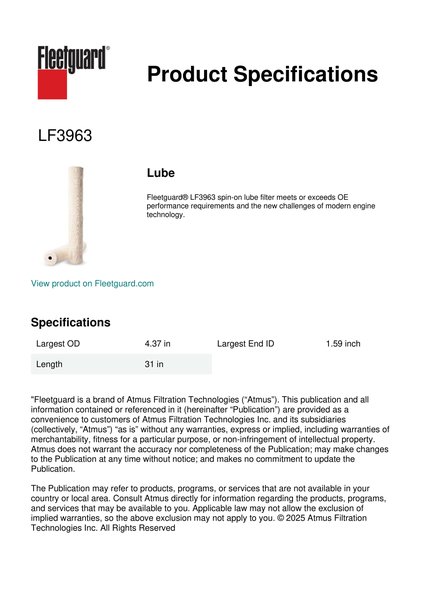 Fleetguard® LF3963 spin-on lube filter meets or exceeds OE performance requirements and the new challenges of modern engine technology.Specification